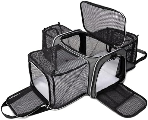 - Breathability and Comfortable:The 5 sided mesh design of this pet travel bag provides plenty of breathability and visibility in any situation, allowing your pet to observe the outside world.With 3 expandable compartments, this cat carrier provides additional space on 3 sides so the pet can stand up and turn around without crouching and contortion on 3 layers removable comfy pads.