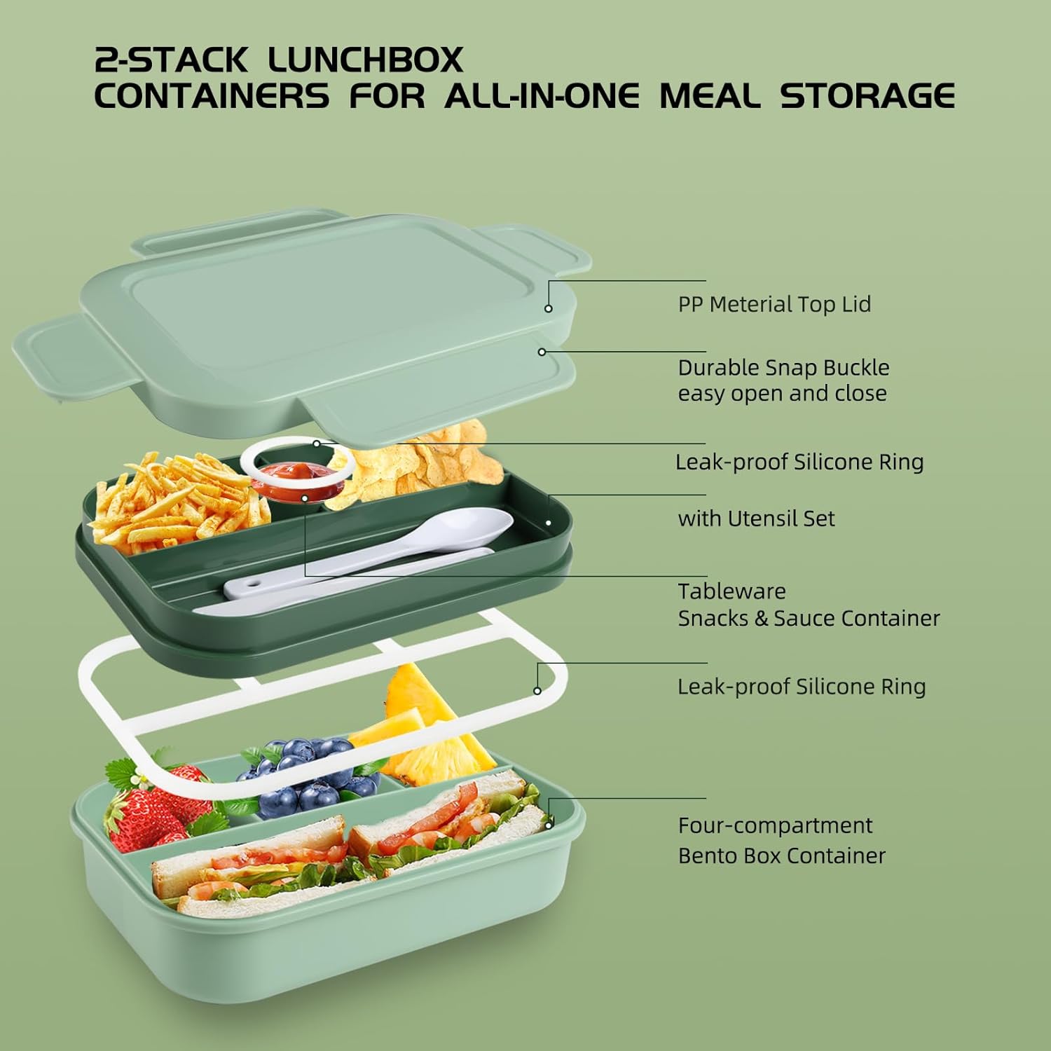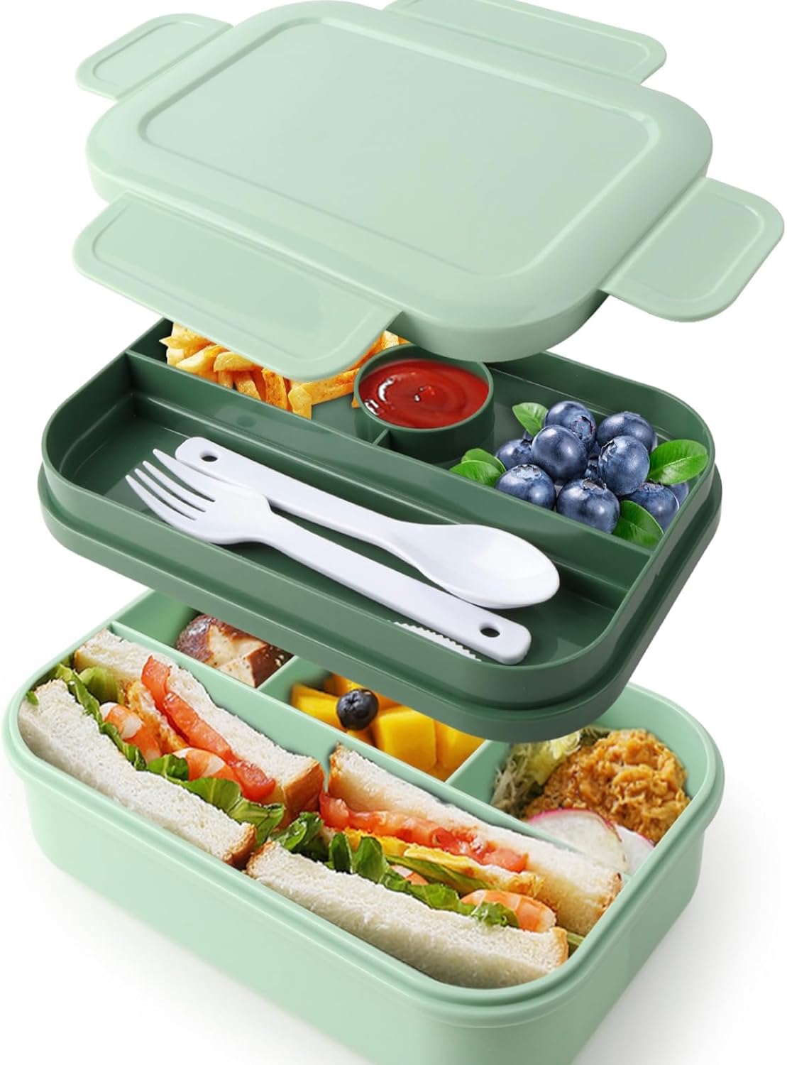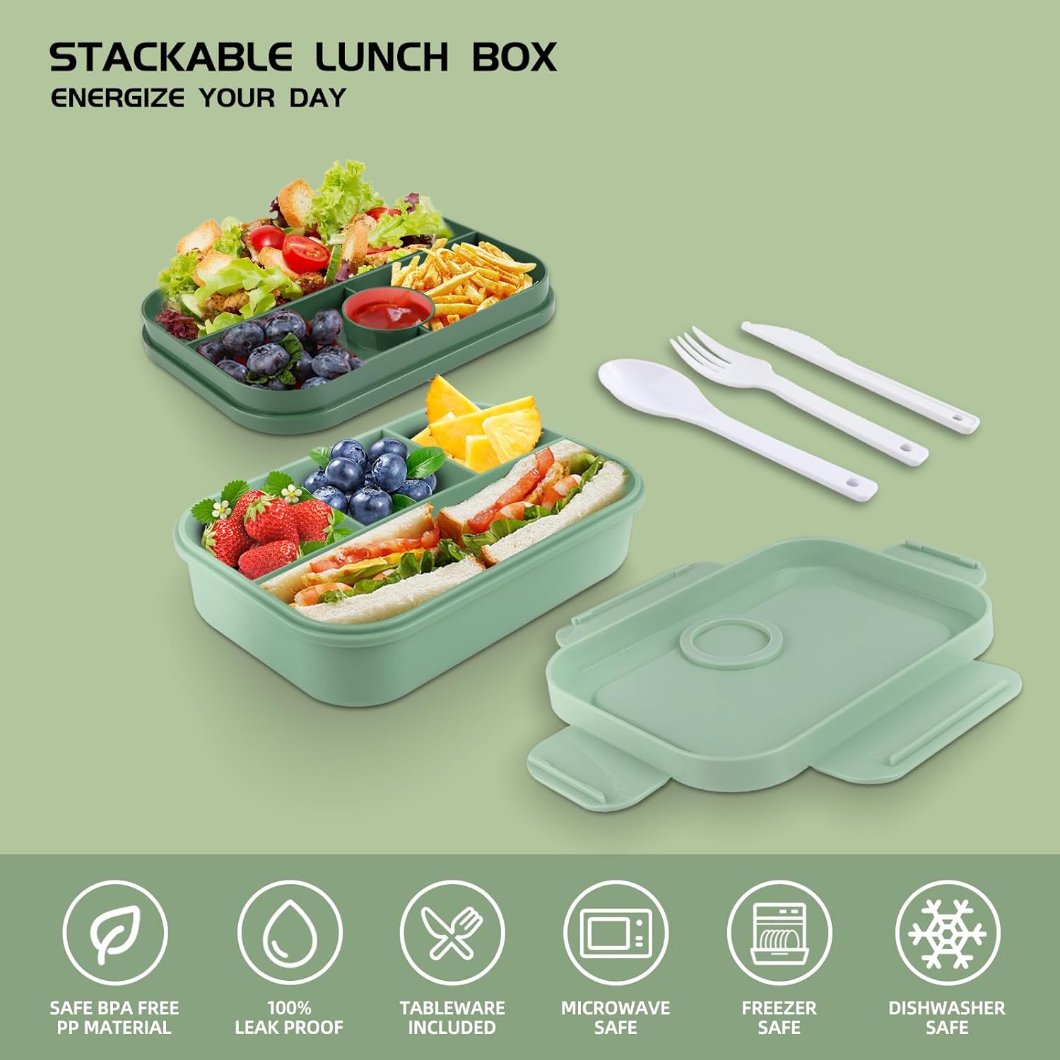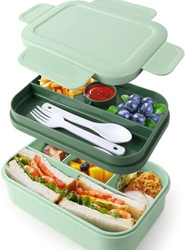 【LEAK-PROOF ALL-IN-ONE BENTO BOX for ADULTS】Our lunch box container features a double-layer fully sealed design for impeccable leak prevention, eliminating messy spills and sauce-soaked bags. Suitable for ages 5 and up, it doesn't stop there; it also includes utensils, ensuring you're fully equipped for hassle-free meals on the go. Bid farewell to spills and the hunt for forks and spoons – it's all neatly packed in one lunch box.