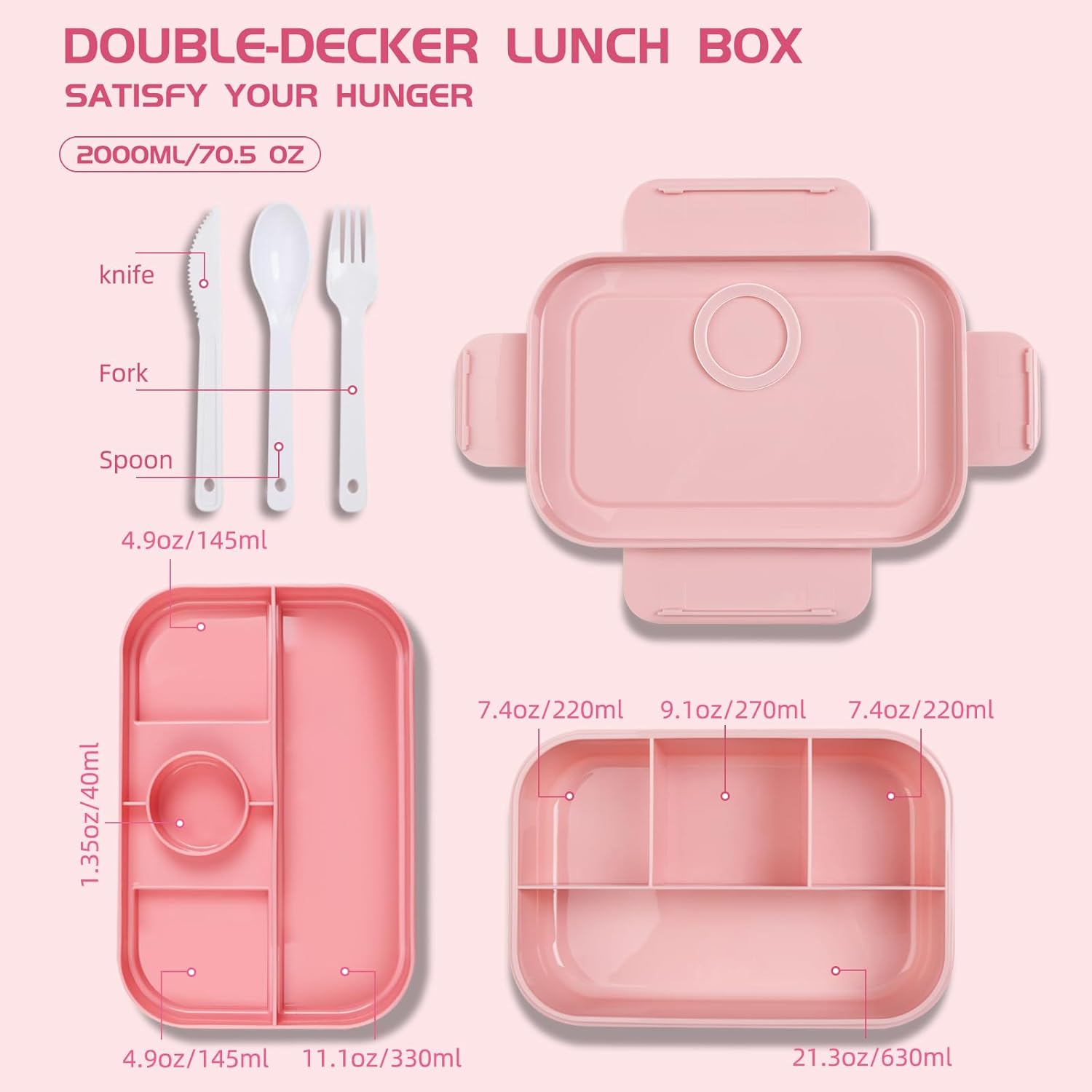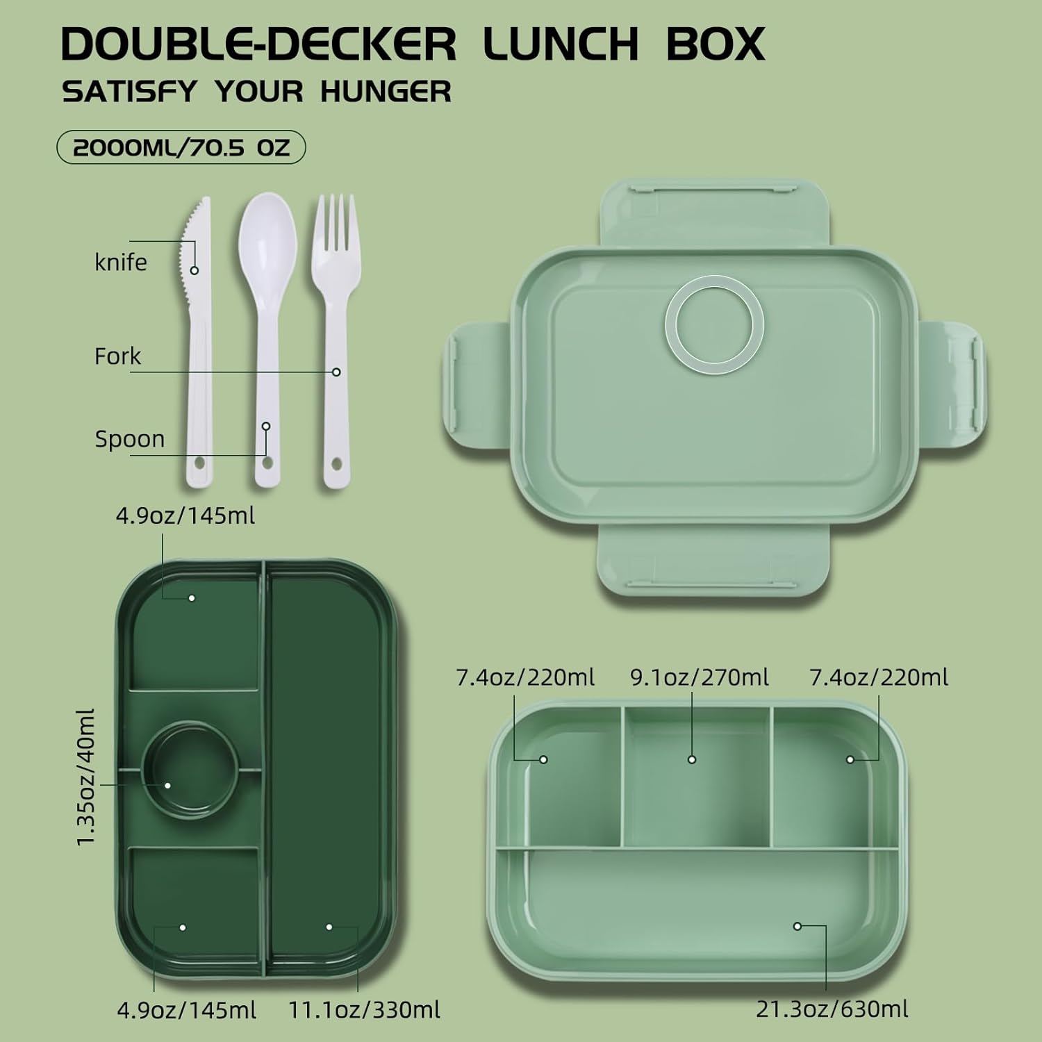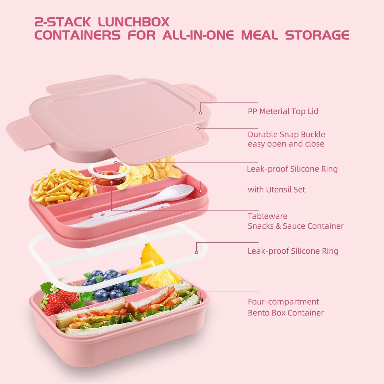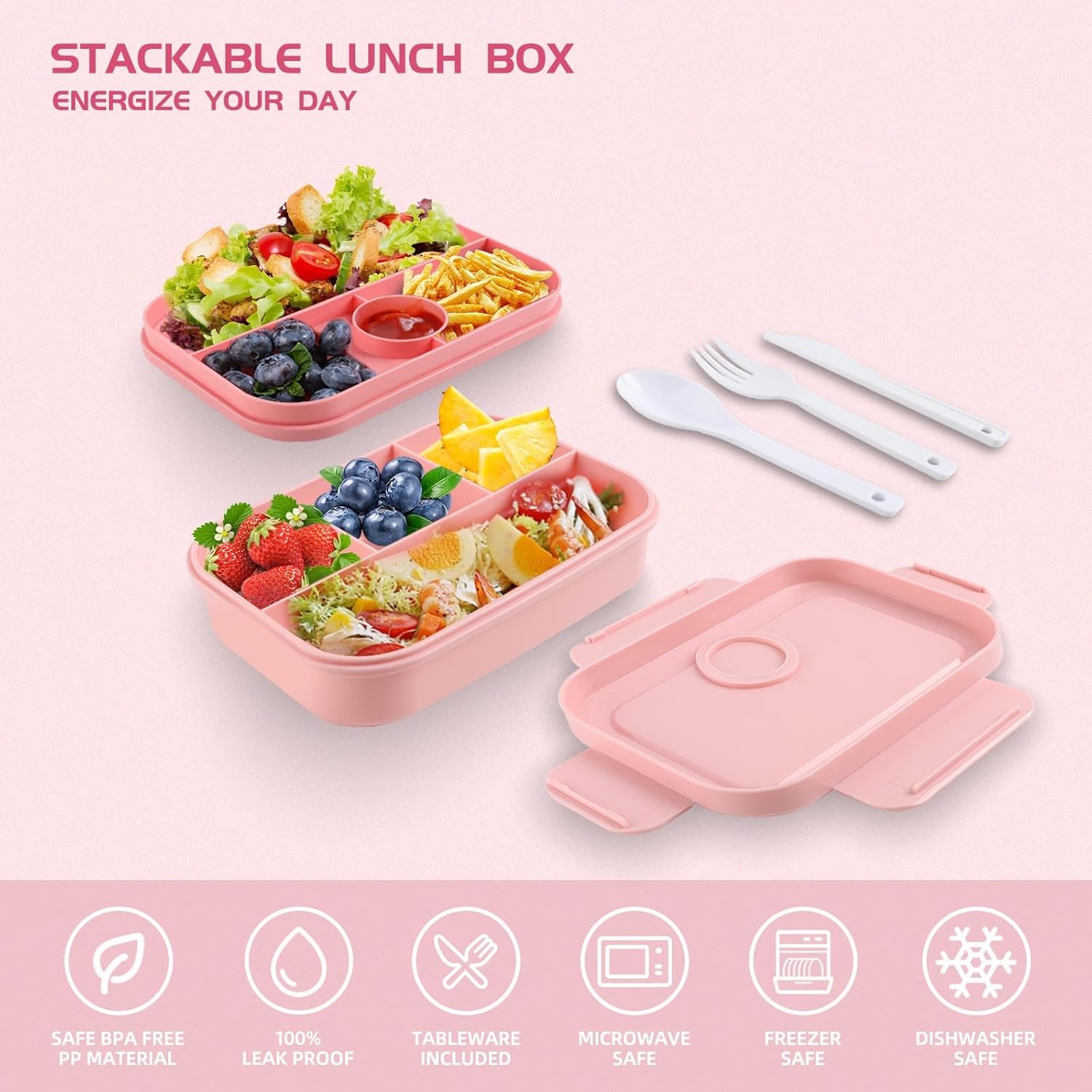 【LEAK-PROOF ALL-IN-ONE BENTO BOX for ADULTS】Our lunch box container features a double-layer fully sealed design for impeccable leak prevention, eliminating messy spills and sauce-soaked bags. Suitable for ages 5 and up, it doesn't stop there; it also includes utensils, ensuring you're fully equipped for hassle-free meals on the go. Bid farewell to spills and the hunt for forks and spoons – it's all neatly packed in one lunch box.