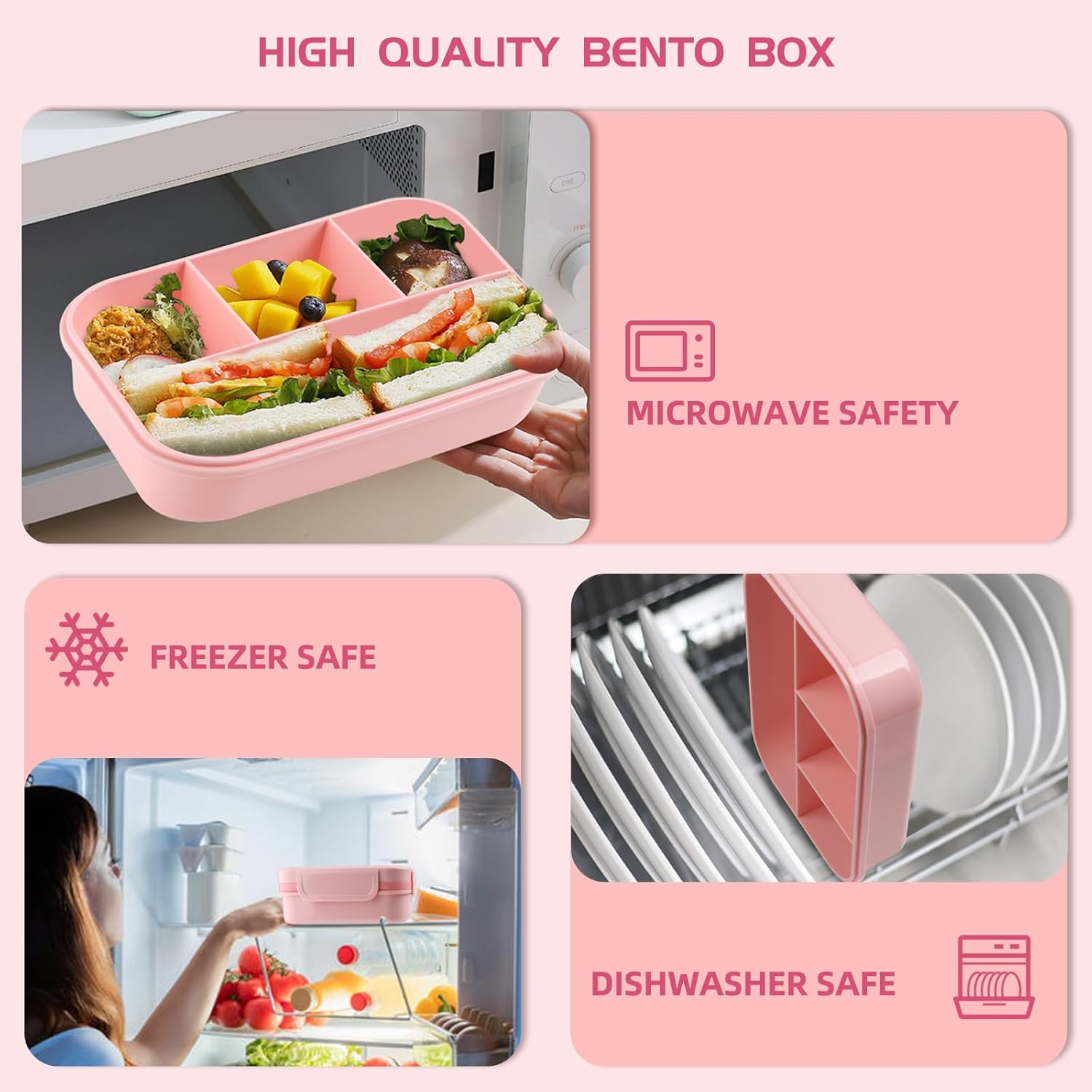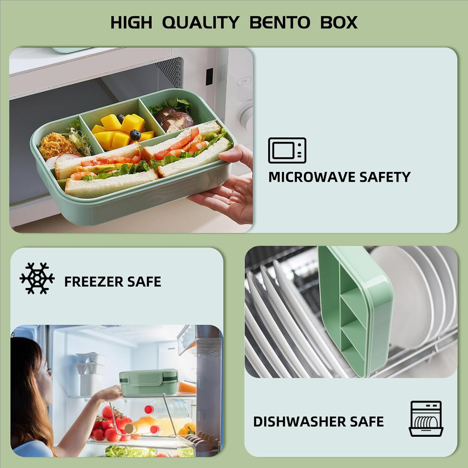 【MICROWAVE, DISHWASHER, and FREEZER FRIENDLY】 Our Bento Box is designed for convenience. You can safely reheat your meal in the microwave, pop it in the dishwasher for easy cleaning, and even store leftovers in the freezer. It's the perfect companion for your busy lifestyle.