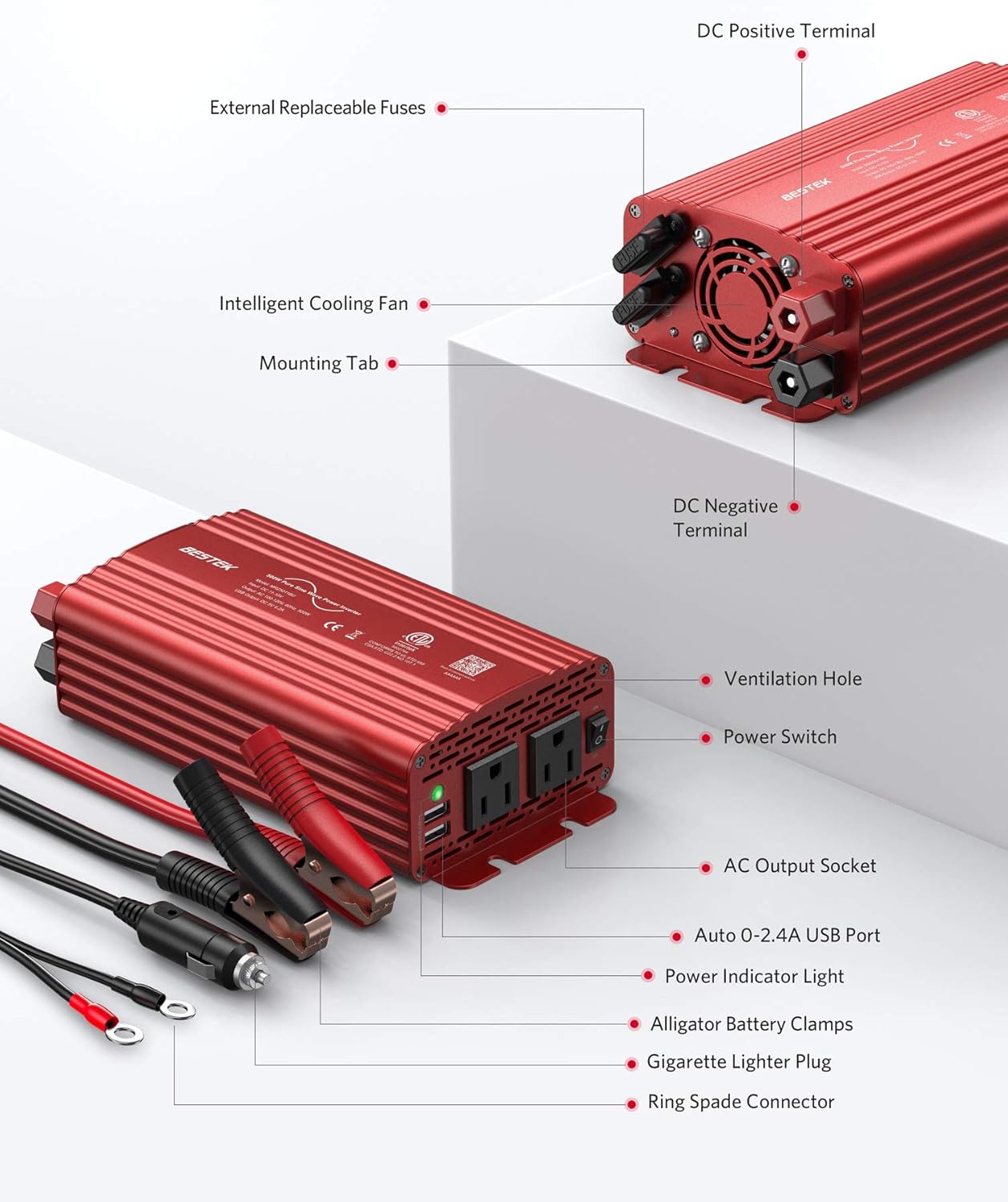 - BESTEK 500W Pure Sine Wave Car Inverter:Its output waveform is same as the AC power waveform of mains power grid which delivers a smoothly-varying sine wave for sensitive electronics provided by the electric utility.Perfects for off-grid system,Lower THD,Less wear,Strong inductive Loads Capability.It has little interference with radios, communication and precision equipment.It's also recommended by most cordless tool manufacturer that a pure sine wave inverter is used to ensure long battery life