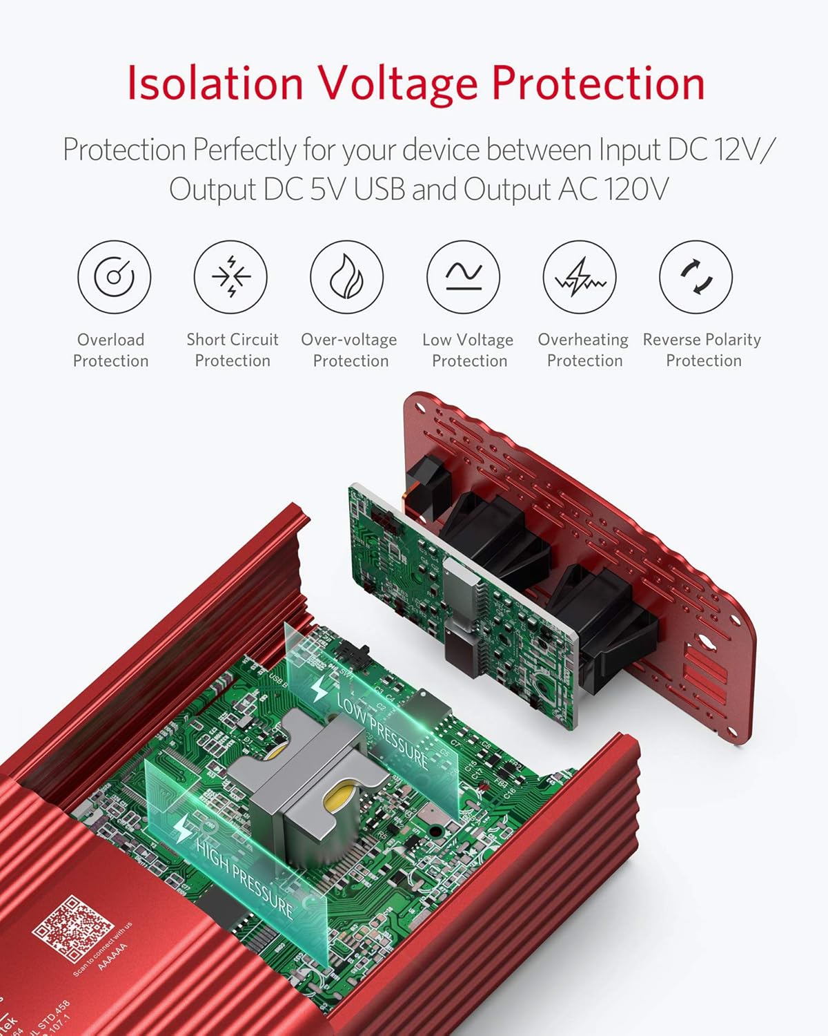 - Isolated Voltage Protects Perfectly for your device from Over-voltage,Under-voltage,Overheat,Overload,Reverse Polarity,Short circuit.it will not drain your battery dry because of an under-voltage protection point.The Inverter does automatically sense overload condition and shuts down AC power when the load exceeds 500W.You will need to power Off/On to reset the overload condition indicated by the Flashing Red.The ON-OFF switch only works for the 3-prong plugs.