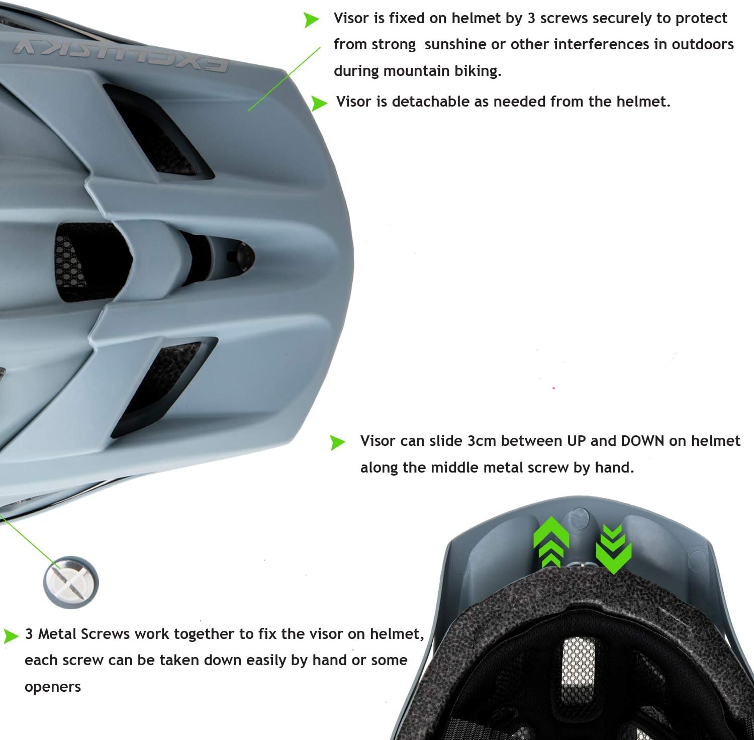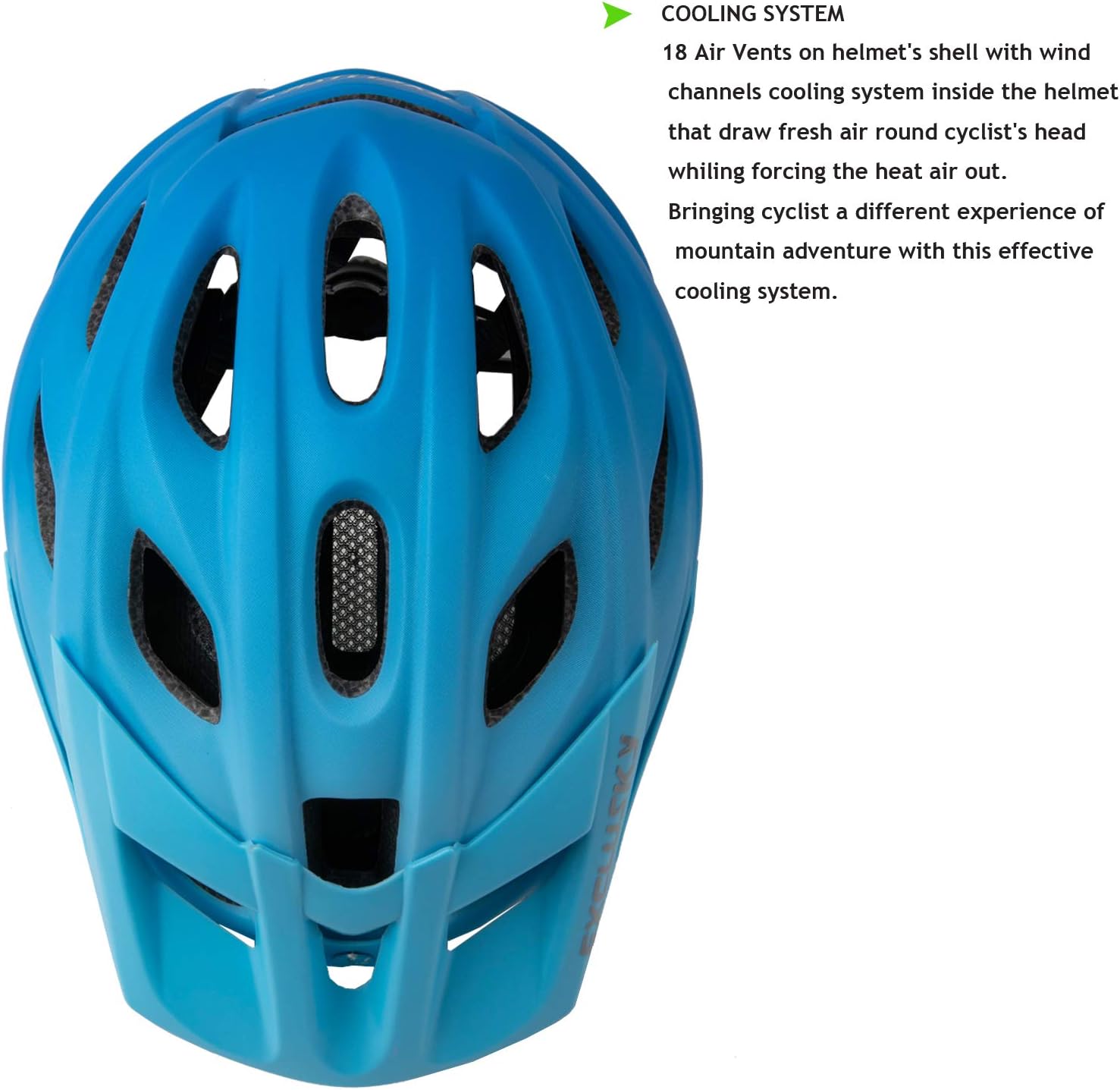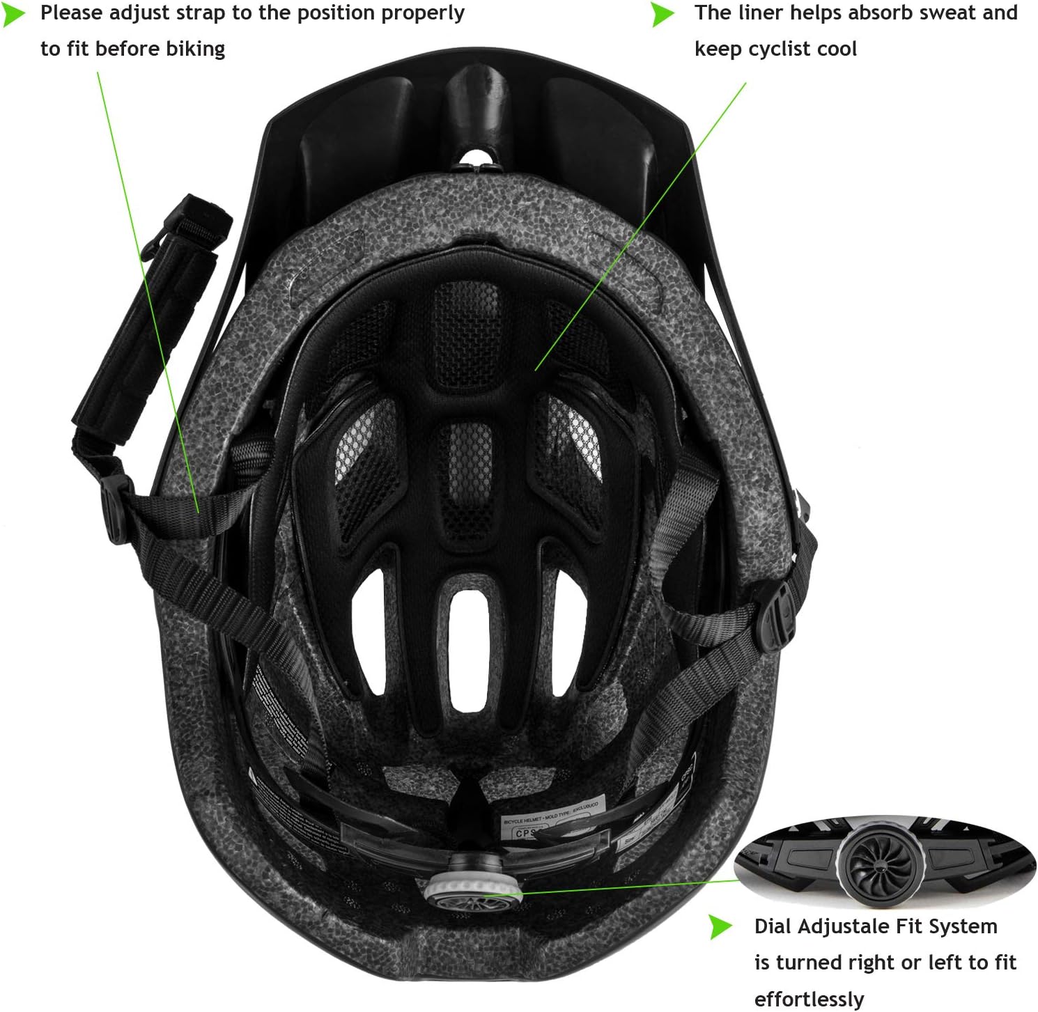 - Reinforced Large Sun Visor: Sun visor on helmet is essential to all-mountain biking lovers, This reinforced large sun visor is designed perfectly to match this biking helmet for you - Visor is easy to move upward and secure to offer you broad sights to keep safe, Vents on Visor guarantee airflow pass to keep you cool.
