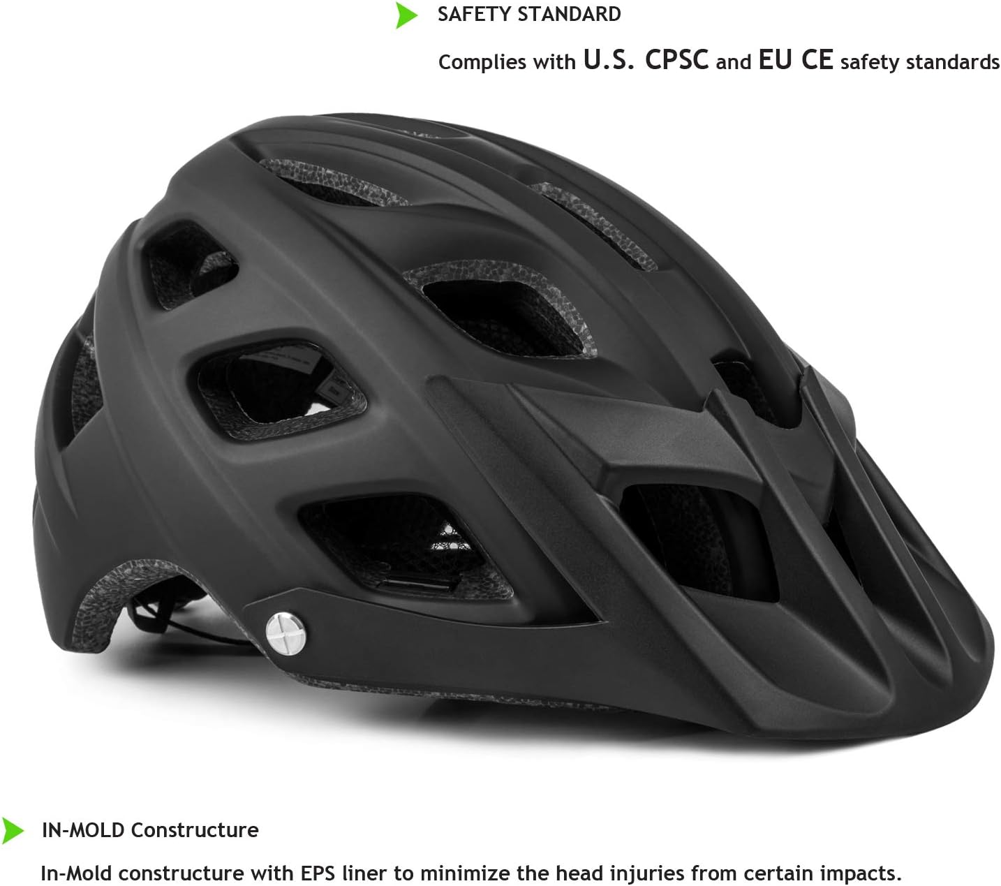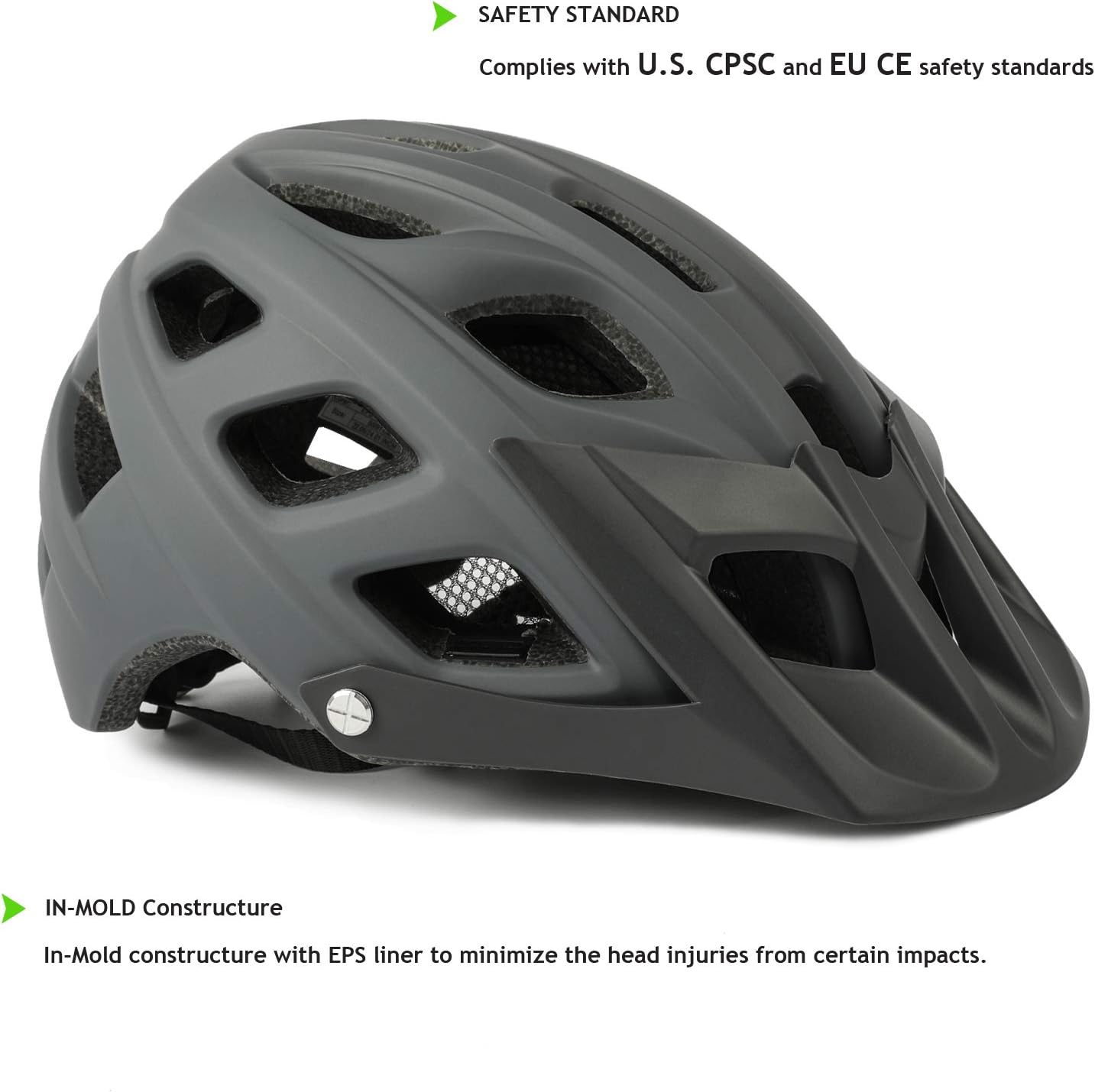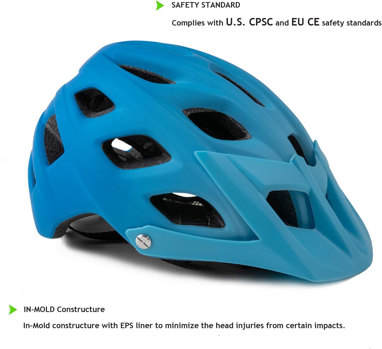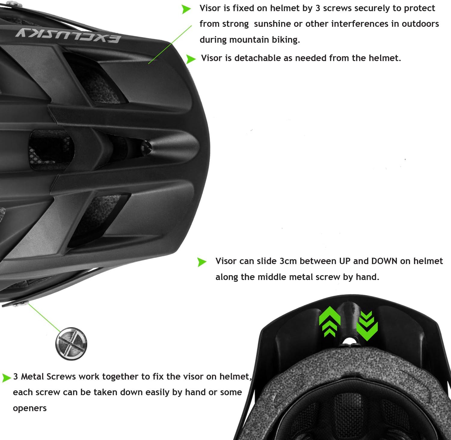 - Reinforced Large Sun Visor: Sun visor on helmet is essential to all-mountain biking lovers, This reinforced large sun visor is designed perfectly to match this biking helmet for you - Visor is easy to move upward and secure to offer you broad sights to keep safe, Vents on Visor guarantee airflow pass to keep you cool.