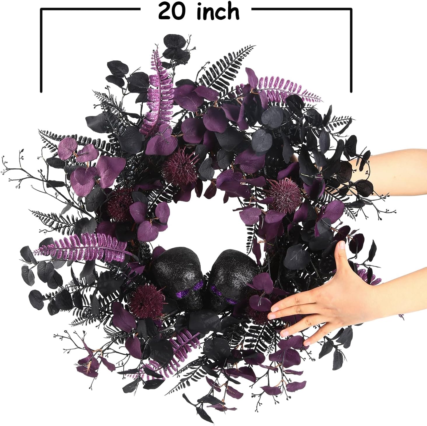 BINFEN 20" Halloween Wreaths for Front Door, Black Glitter Skulls Purple Eucalyptus Leaves Halloween Horror Decor, Gothic Party Room Decoration