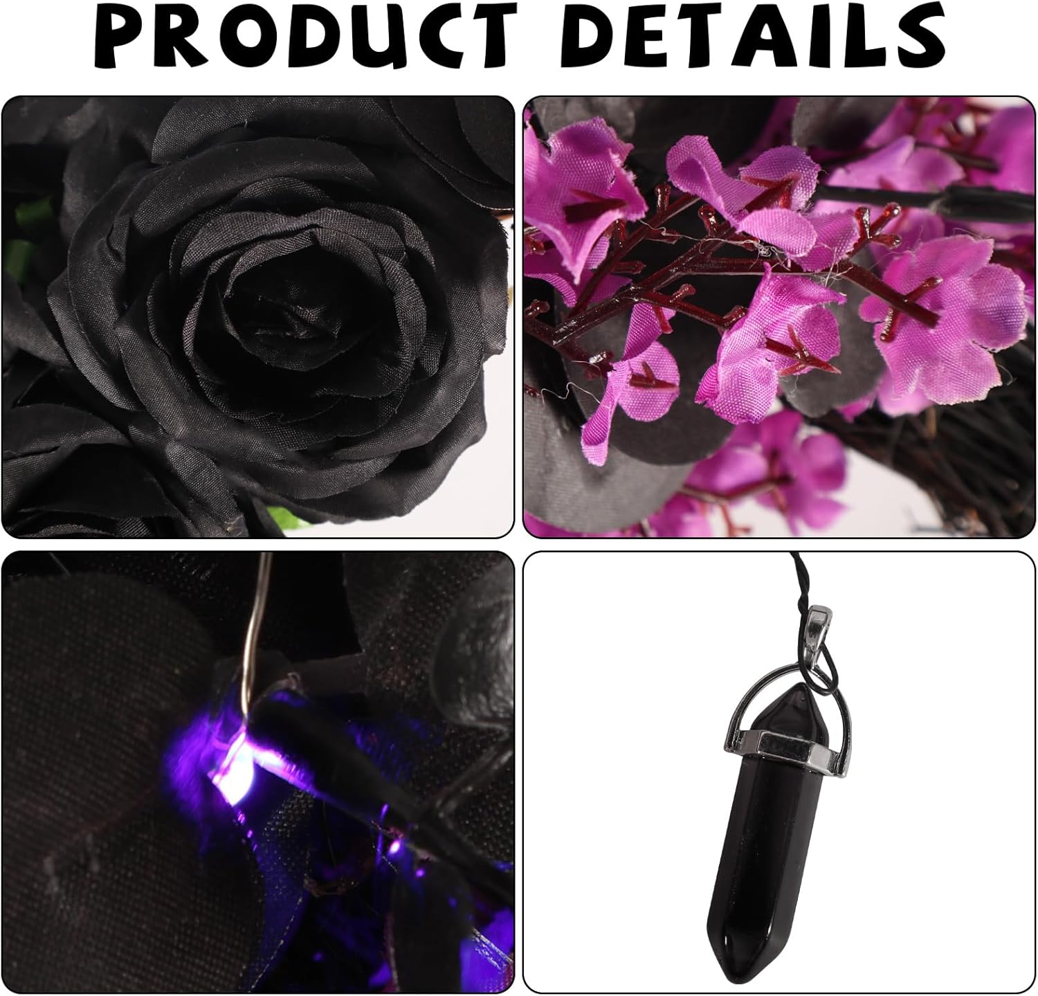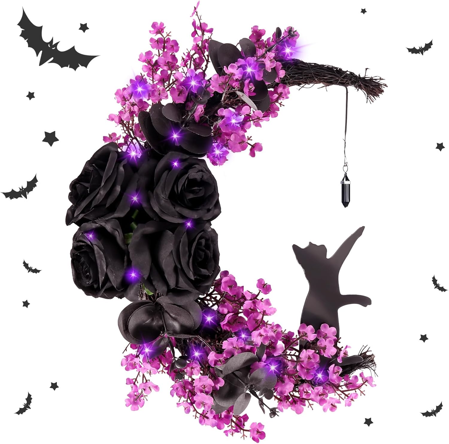 - This Halloween wreath features classic Halloween elements such as the moon, black cat, black rose, and rattan, adding a touch of Gothic mystery to your Halloween decor