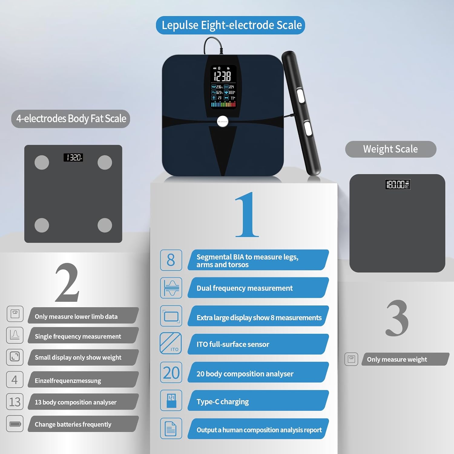 - FULL BODY COMPOSITION SCALE: Unlike other 4 electrode body weight scales for people, which only measure half of the body, Lepulse smart scale with body fat percentage utilizes eight-electrode technique for segmental BIA. Dual-frequency, comprehensively measure 5 segmental of your body(4 limbs and torso) by double frequency. High precision scale provide 20 body compositions including weight, body fat and bmi, muscle mass, water weight%, bone mass, subcutaneous fat, etc.