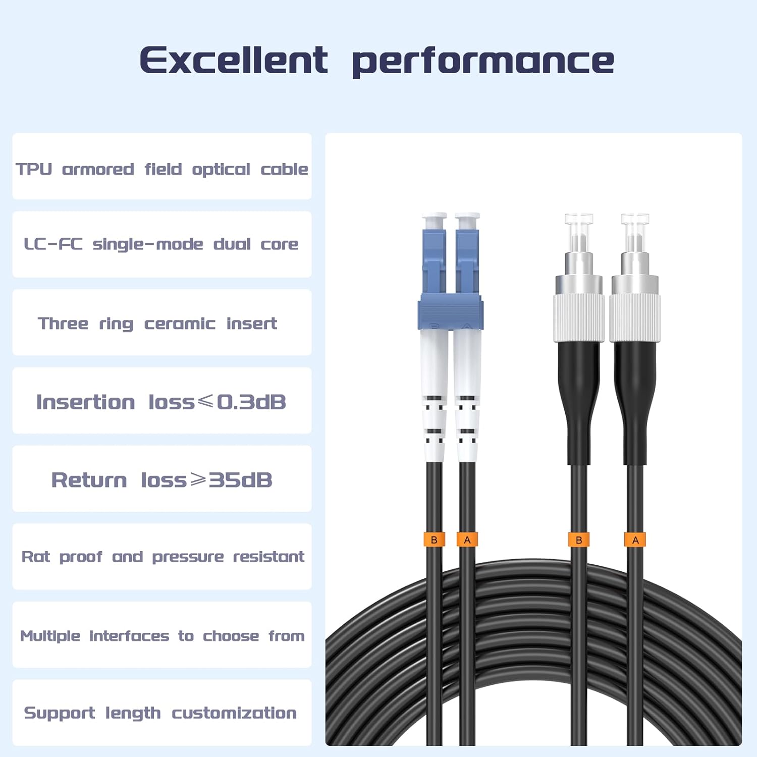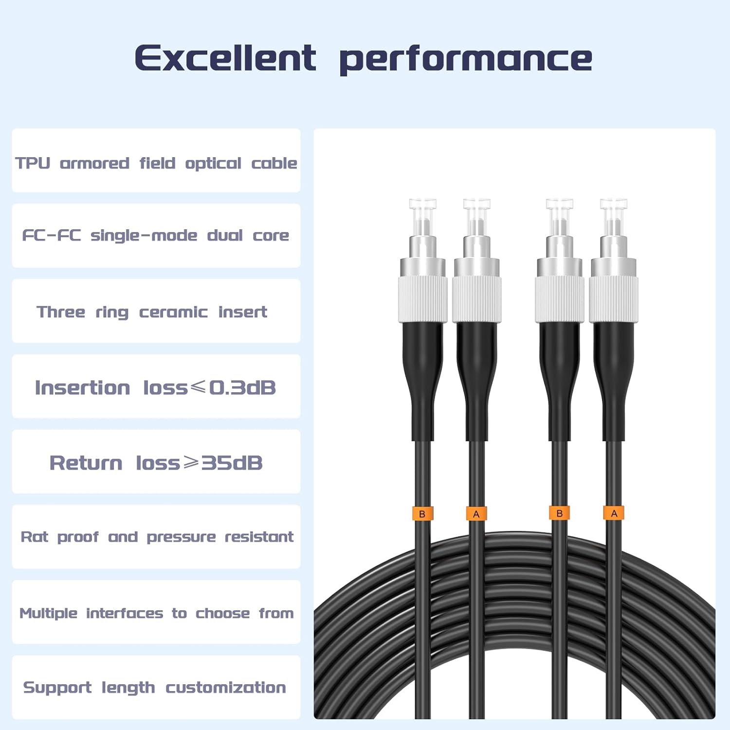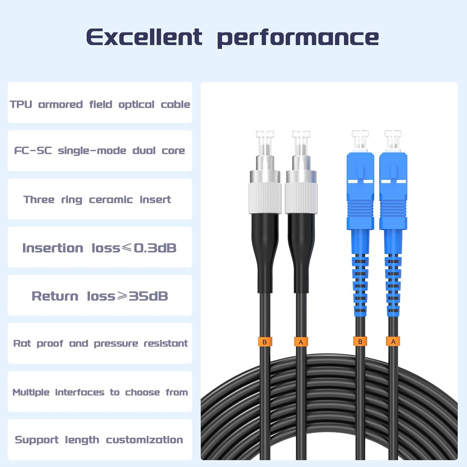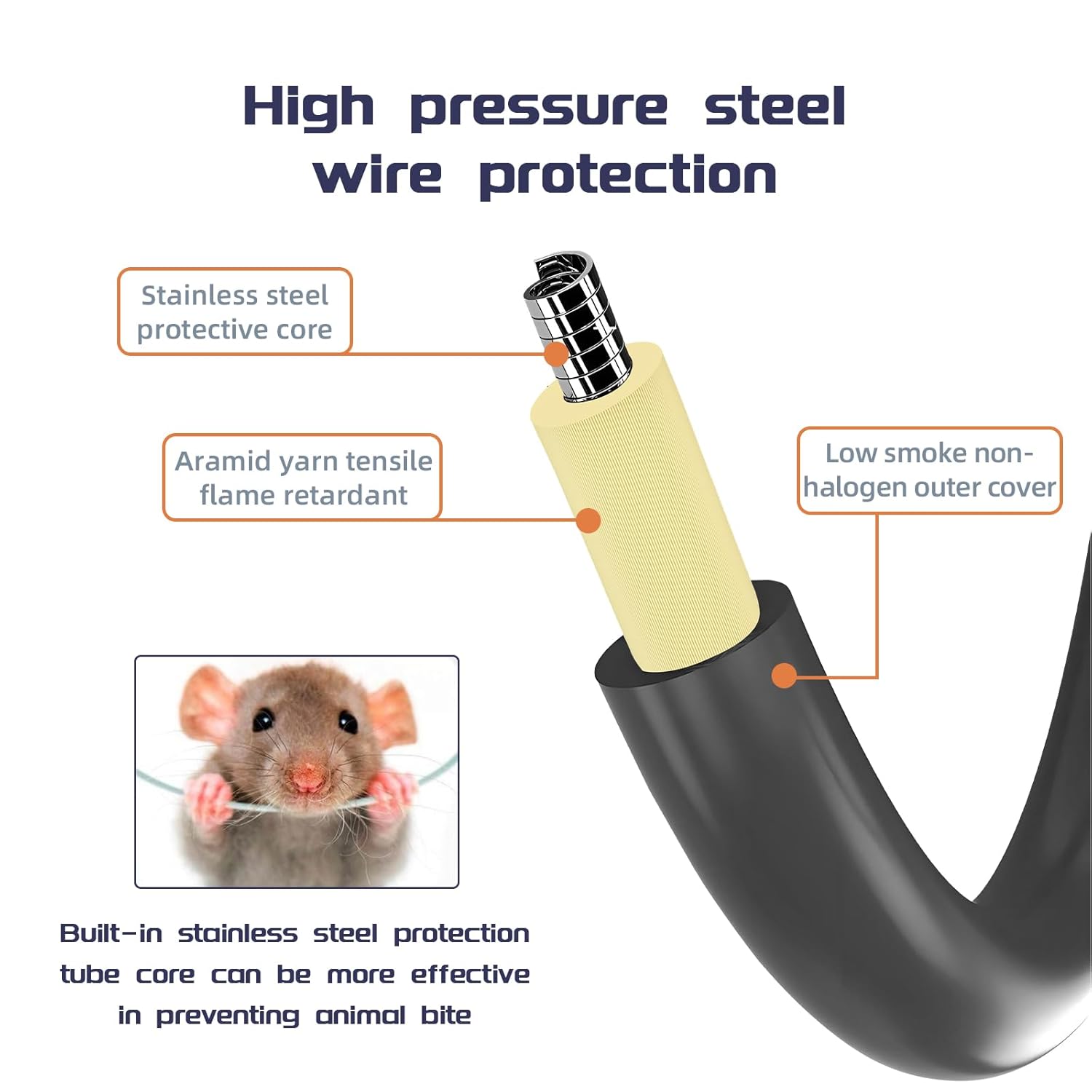 • 【Special Design】 This outdoor armored fiber optic patch cord features an added layer of stainless steel tubing to protect the fiber, providing high tensile strength, compression resistance, bending resistance, fire retardancy, moisture resistance, and protection against rodent damage.