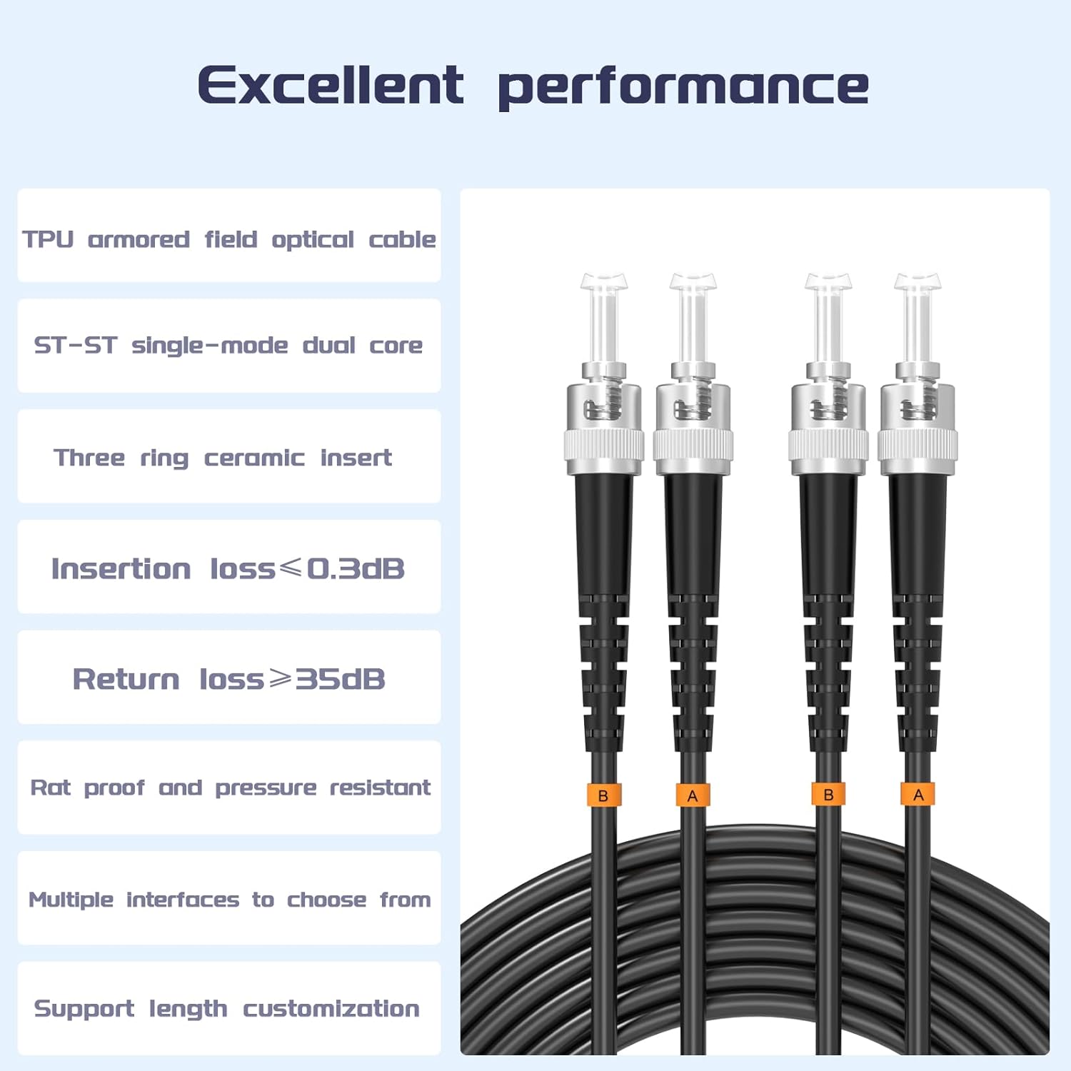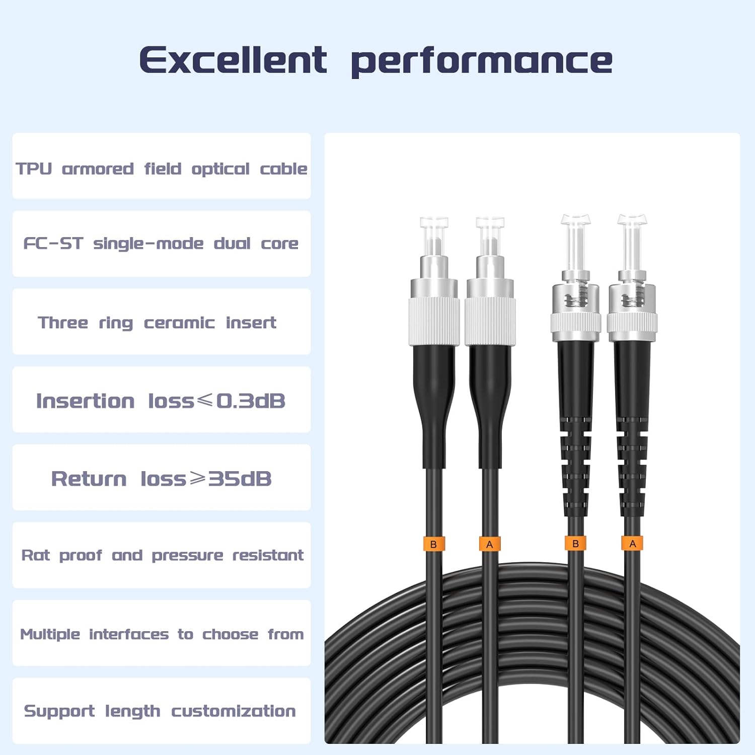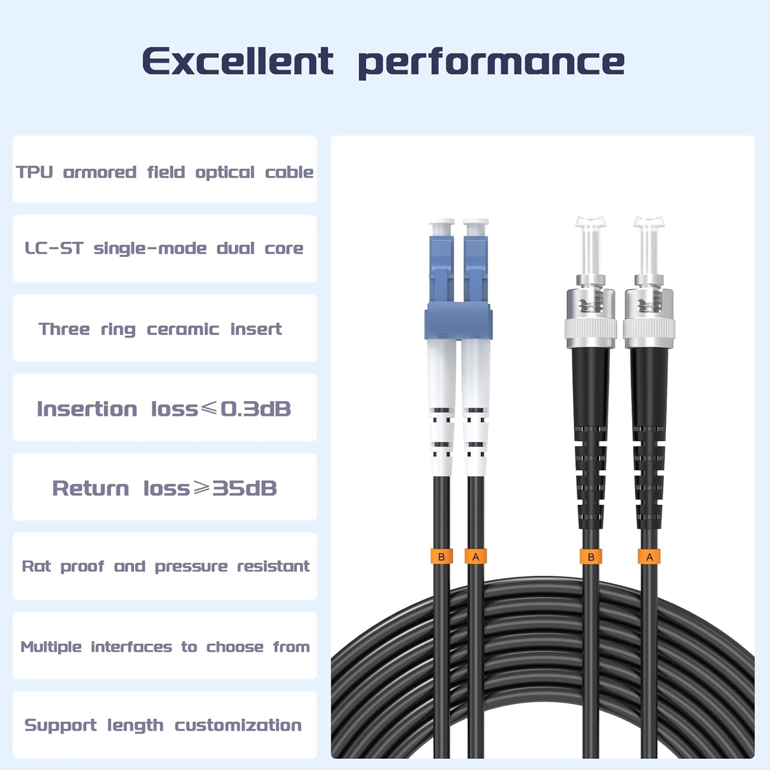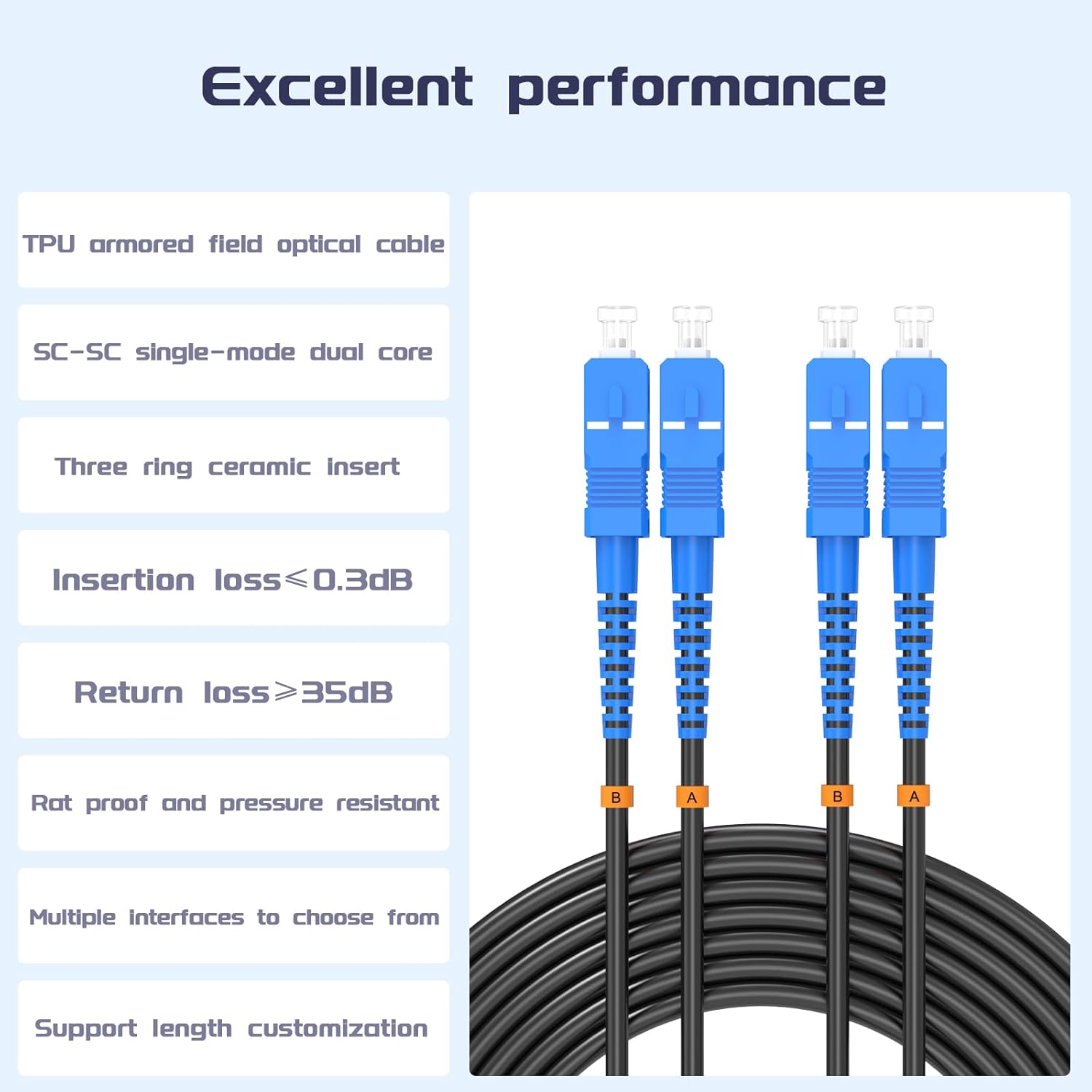 • 【Special Design】 This outdoor armored fiber optic patch cord features an added layer of stainless steel tubing to protect the fiber, providing high tensile strength, compression resistance, bending resistance, fire retardancy, moisture resistance, and protection against rodent damage.
