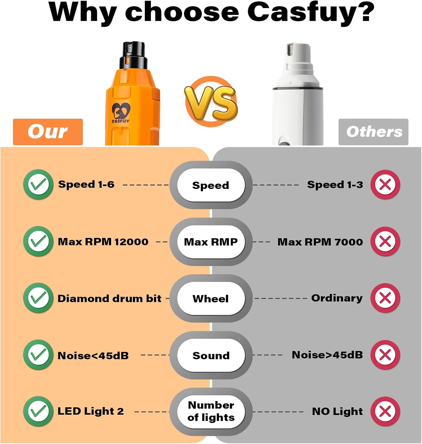 - Say goodbye to over-clip: Over-clipping is the worst during nail trimming. Dual LED lights on Casfuy electric dog nail trimmer will help you prevent it. The lights let you see the nail quick easier, making the grinding safer and more precise. The advanced diamond drum bit grinder will deliver the most comfortable pet claw grinding.