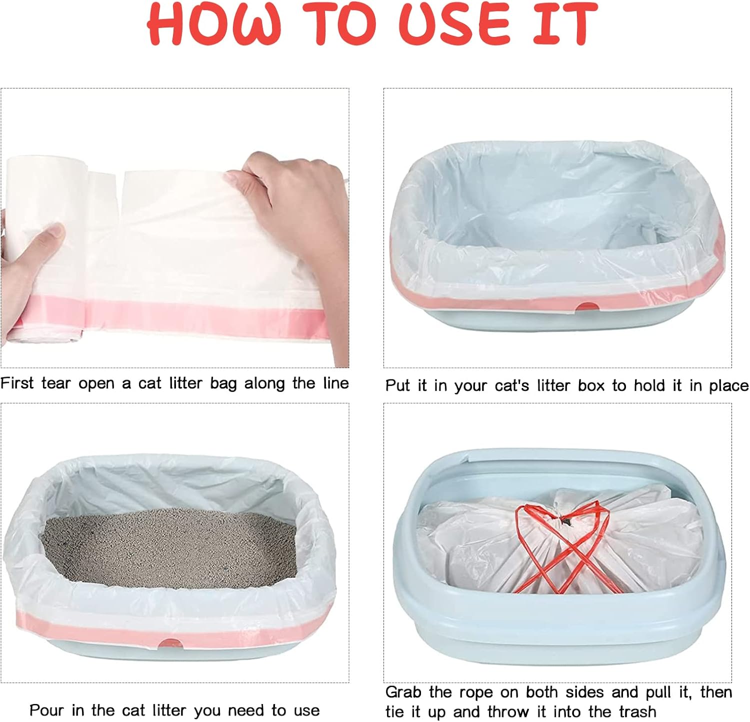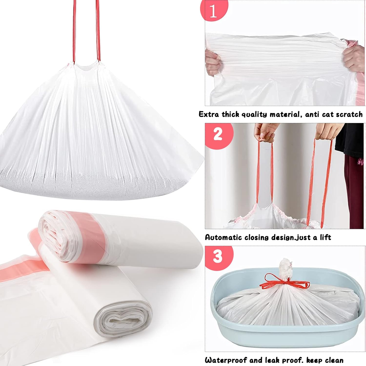 • Drawstring Design, Convenient Cleaning: Cat trash bags designed with drawstring make cleaning litter a cinch. No More Messes, No More Scrubbing, No Odor. When it’s time to change the litter, just lift litter bags ties, close and throw away. Cat owners can finish clean kitty litter box within 30S. Save your cleanup time, perfect for the busy household of cat lovers.
