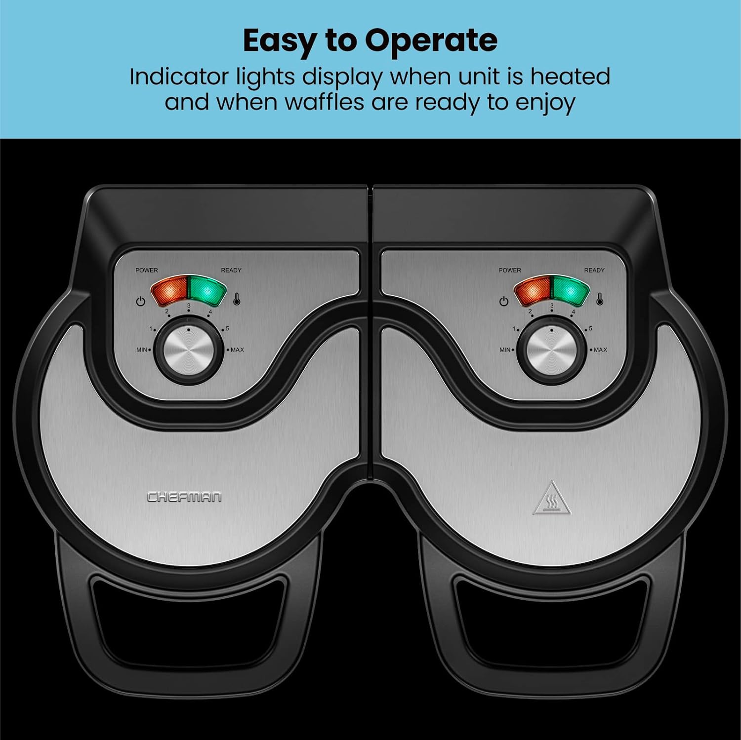 Chefman Anti-Overflow Belgian Waffle Maker w/ Shade Selector, Temperature Control, Mess Free Moat, Round Iron w/ Nonstick Plates & Cool Touch Handle, Measuring Cup Included, Red