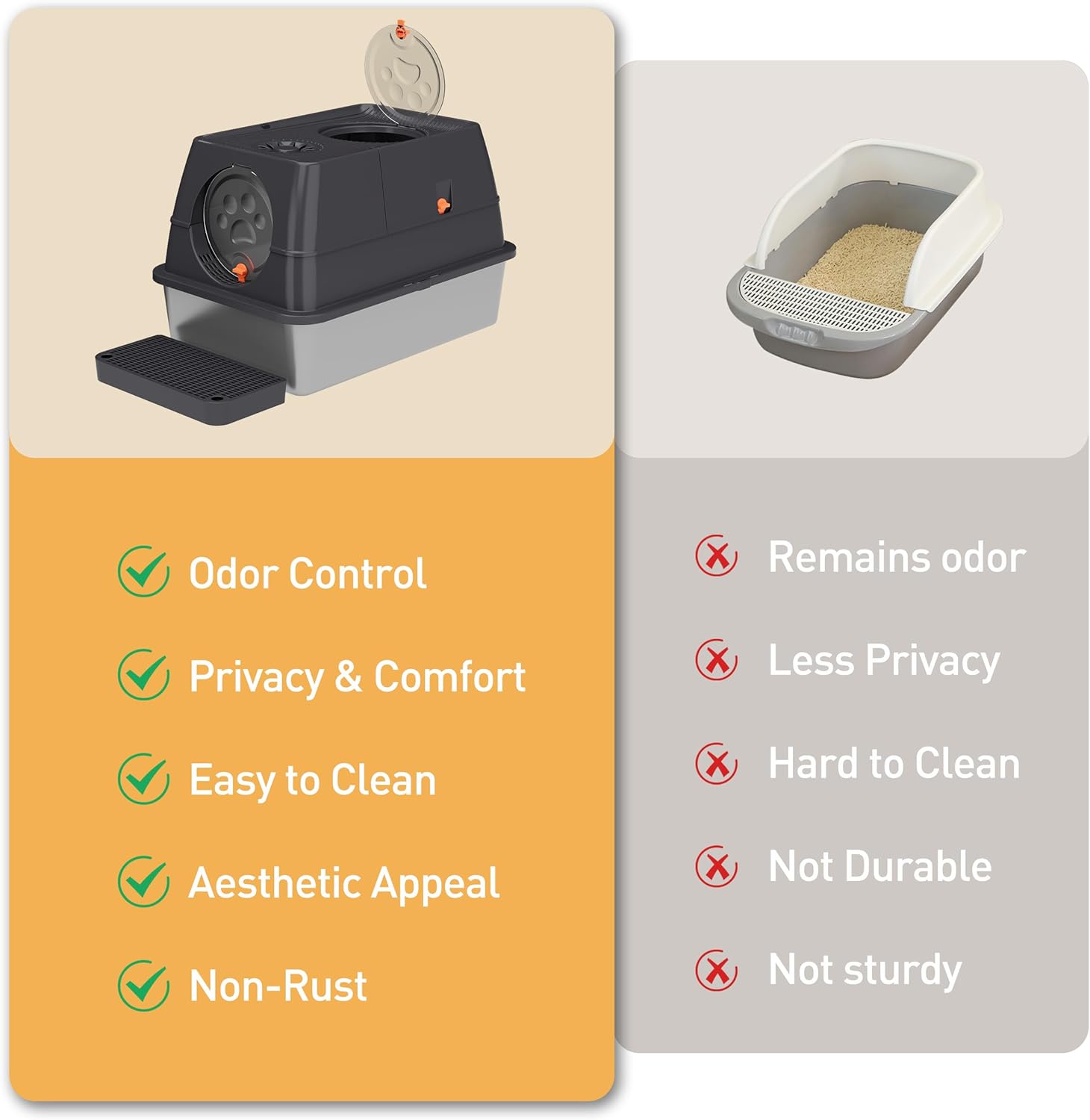 - Advanced Odor Control & Effortless Maintenance: The smooth stainless steel surface wipes clean instantly, making maintenance a breeze. Additionally, the stainless steel litter box is designed to support optional nanocrystalline or activated carbon bags (sold separately) for enhanced air freshness and a more pleasant living environment.