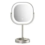 Manage your magnification with the rechargeable Conair® Reflections mirror that features an easy-to-position double-sided frame with a flip. The 9.5-inch mirror goes from 1x magnification to 10x magnification and can be rotated 360° for a custom view at any angle. Mounted on a swivel display with a no-slip, no-tip weighted base and a tray base to store your makeup, brushes, and other accessories. Our mirror is illuminated with lifetime LED bulbs that never need to be replaced. Choose from 3 light settings (low, medium, and high) to customize the light depending on your location, time of day, and beauty needs. The brushed nickel finish gives this must-have mirror a sleek, modern look that complements any vanity.