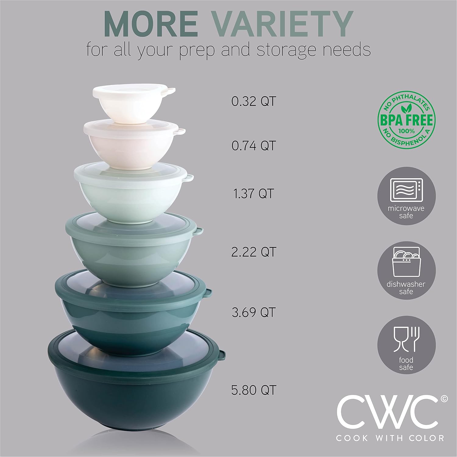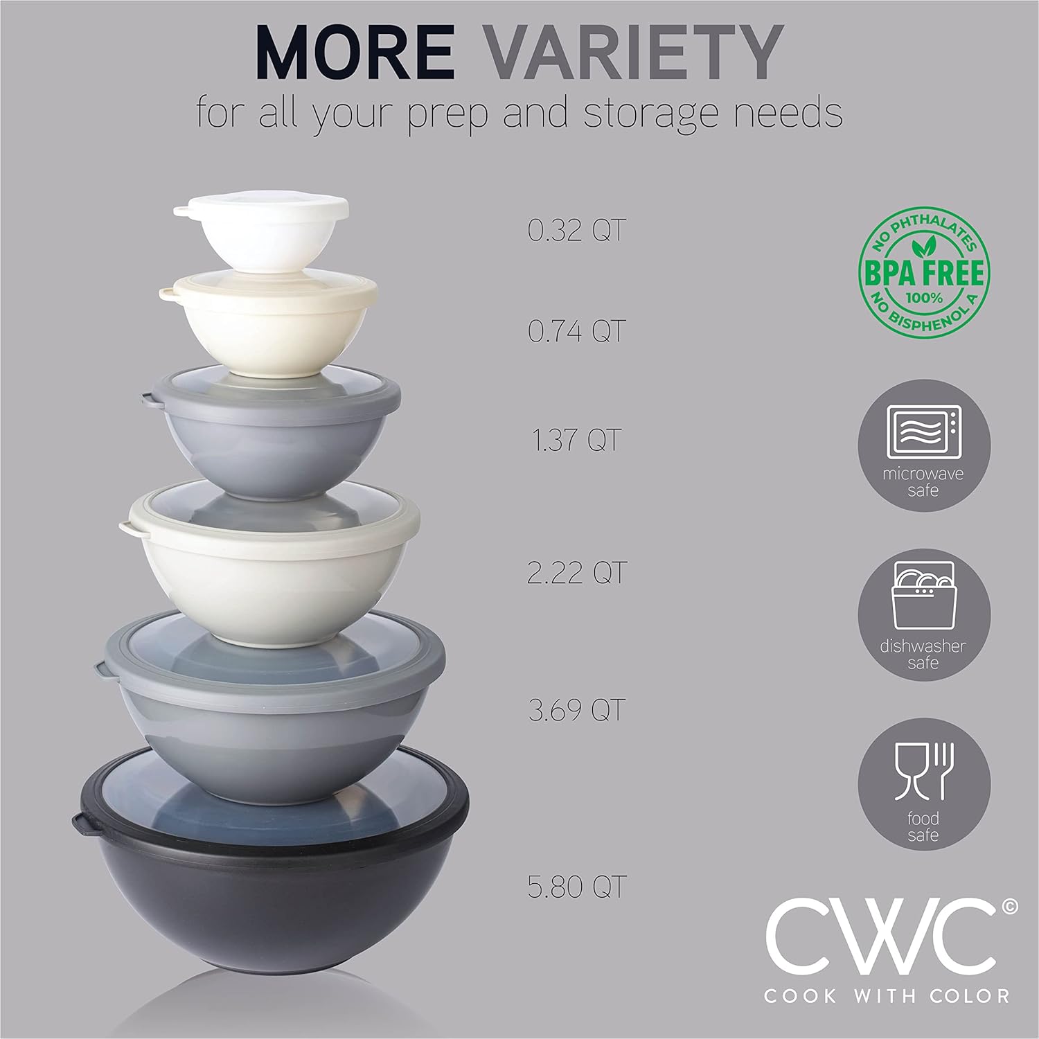 • Set includes 6 plastic bowls and 6 TPR lids; Bowl capacity of 0.32 QT, 0.74 QT, 1.37 QT, 3.69 QT and 5.8 QT.