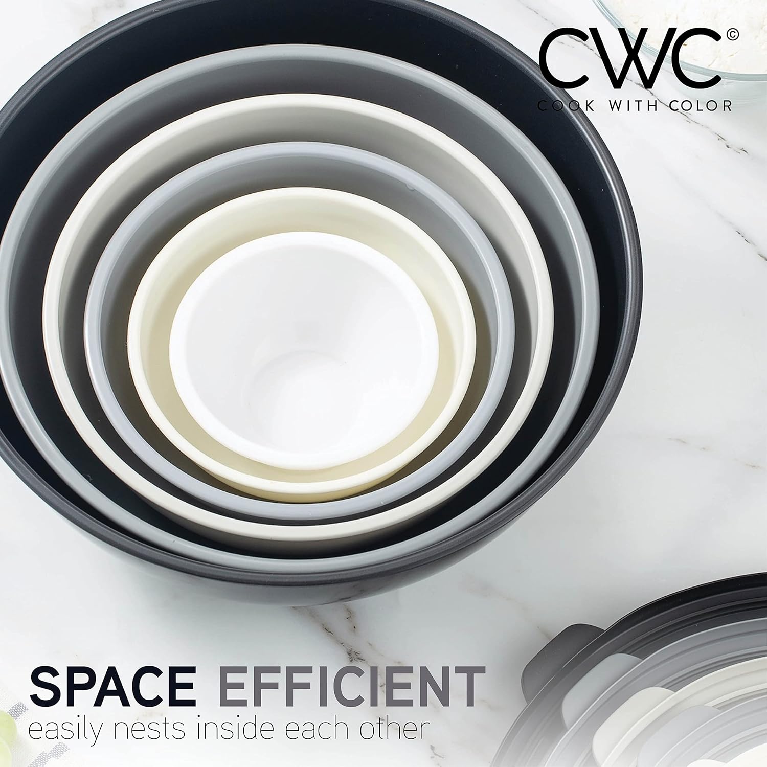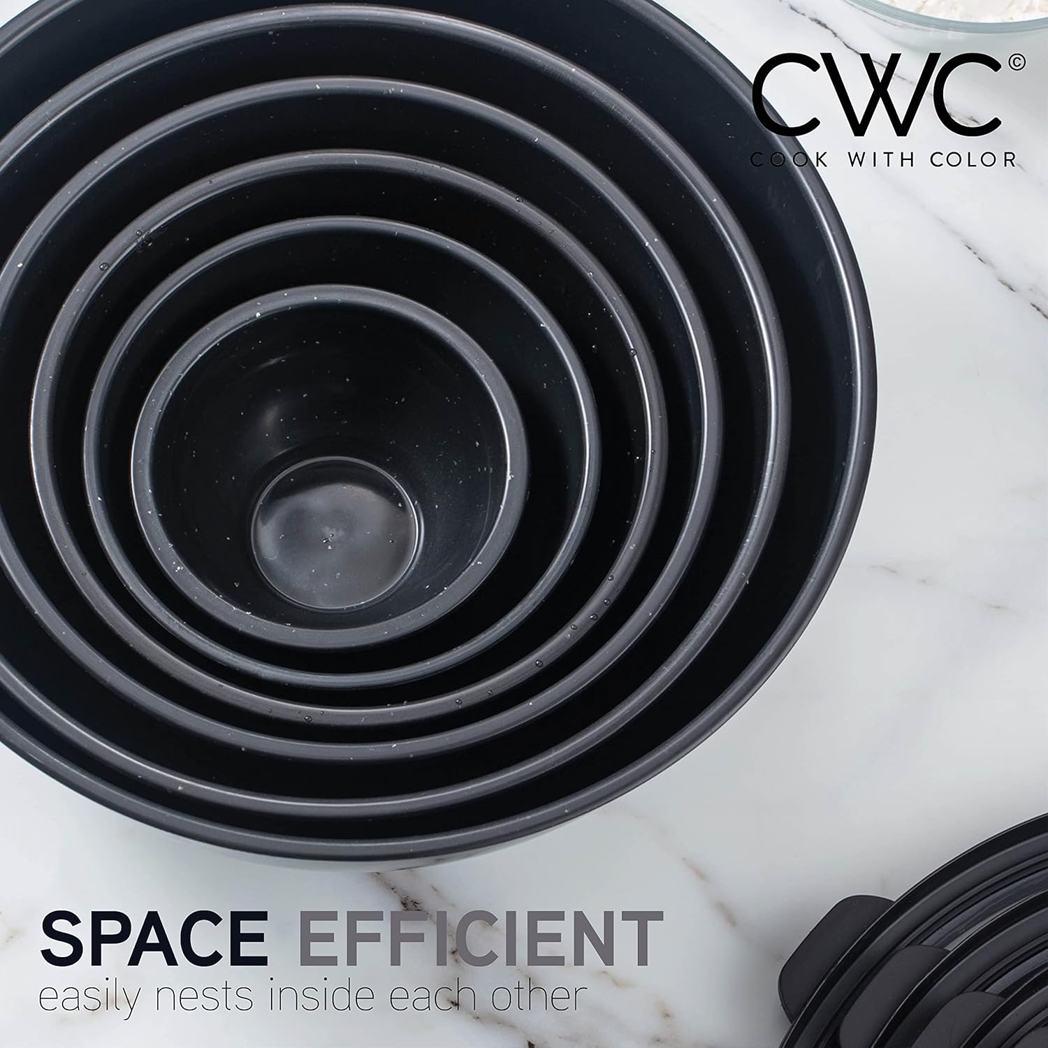 Cook with Color Mixing Bowls with Lids - 12 Piece Plastic Nesting Bowls Set Includes 6 Prep Bowls and 6 Lids, Non Slip Bottom and Embossed Design - Microwave Safe (Black)