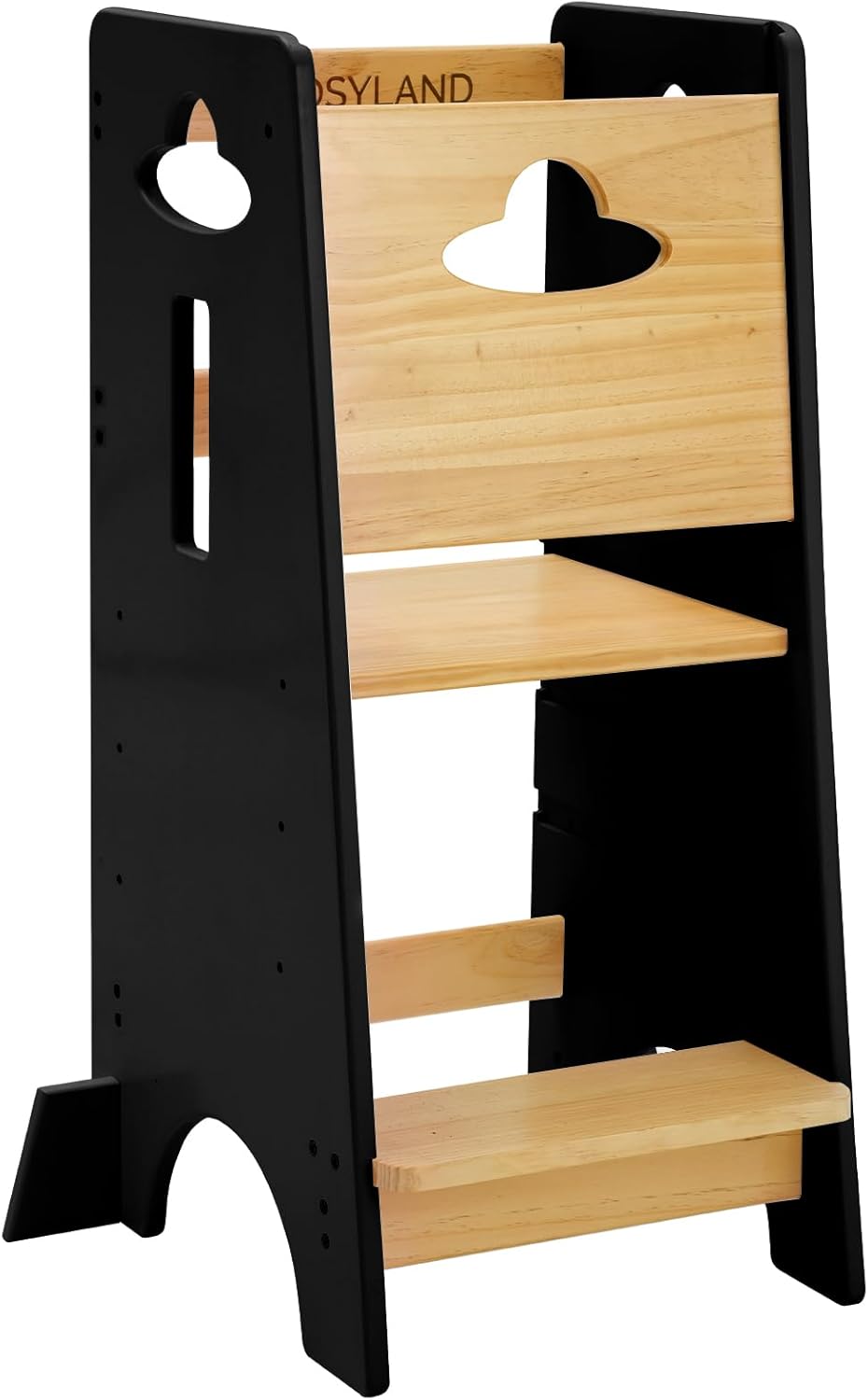 COSYLAND Toddler Standing Tower Adjustable Height - Wooden Sturdy Kitchen Step Stool - 3 Levels Adjustable Kids Learning Stool Kitchen Nursery Helper Stand (Wooden and Black)PL17-B0DY1J5YDX