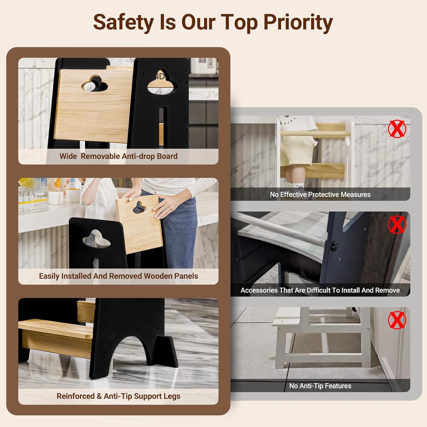 Safe and Secure: Our durable learning tower comes with a removable anti-drop board to prevent falls, plus non-slip strips and rubber feet for added stability. You can trust it to keep your little ones safe while they play and learn kitchen skills.