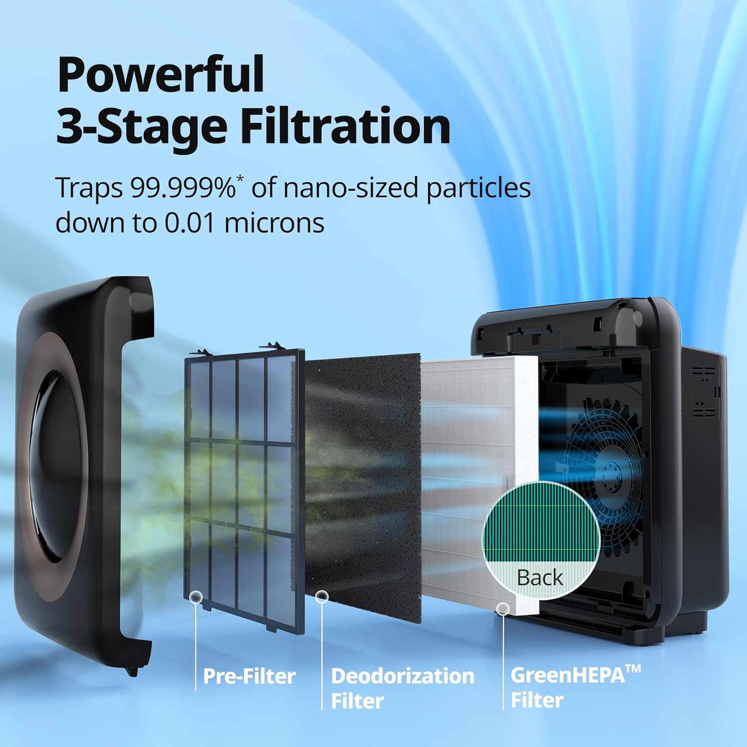 - [HyperCaptive Filtration System] Dynamic combination of a washable pre-filter, deodorization filter, and True HEPA Filter effectively reduces 99.999% of 0.01-micron particles in the air, including pollen, pollutants, and other allergens. It also reduces 99% of volatile organic compounds and odor.