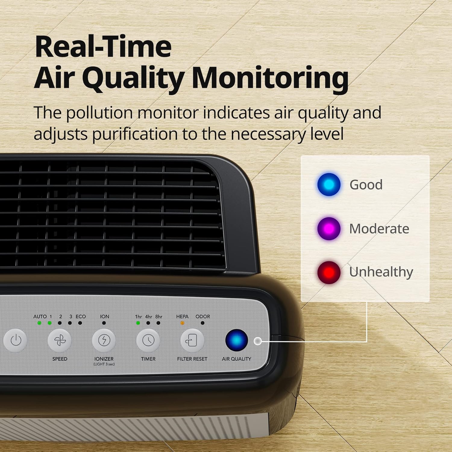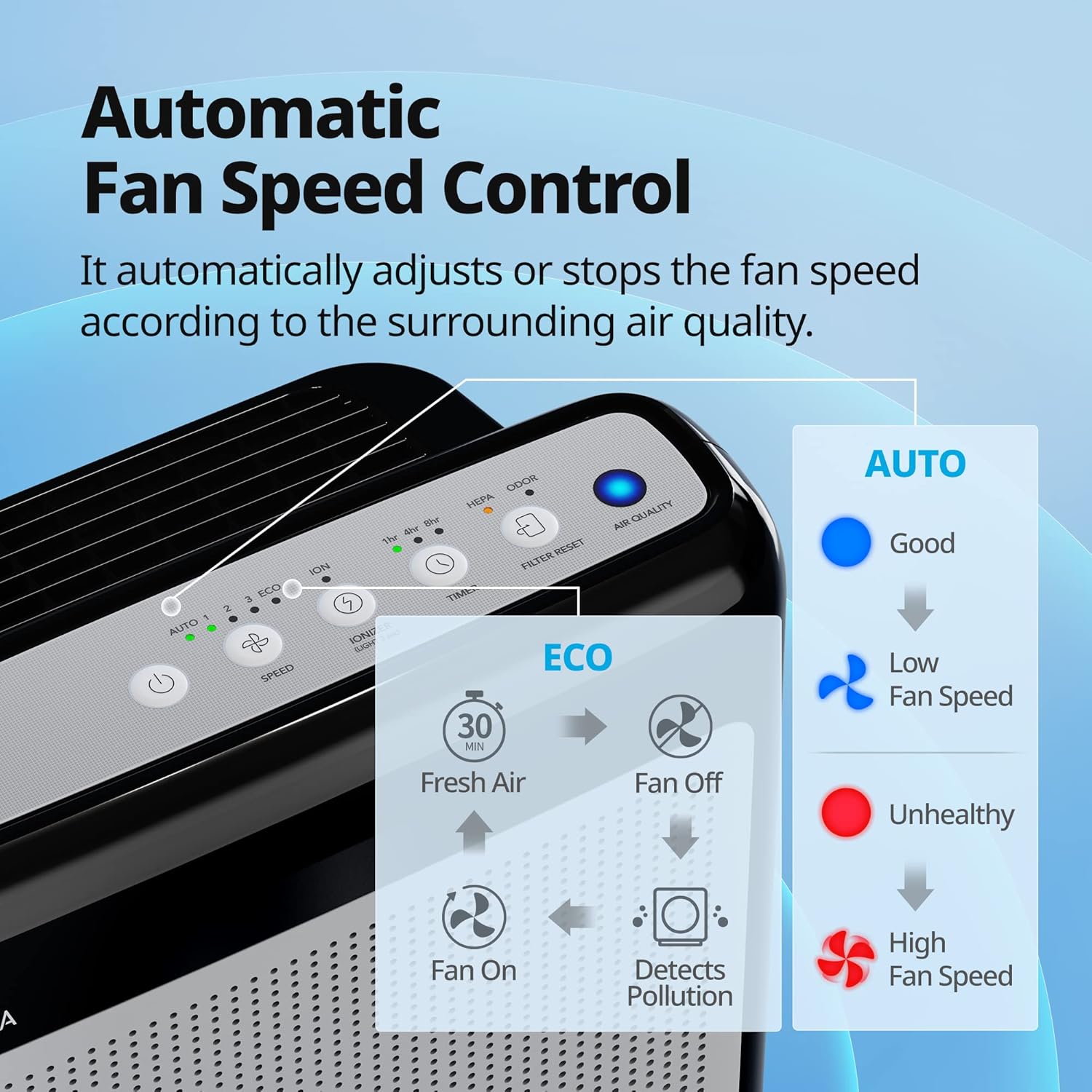 - [Auto Mode] Constantly monitoring the air quality, the fan automatically adjustes to most effectively purifiy your space as needed providing a new level of clean in real time.