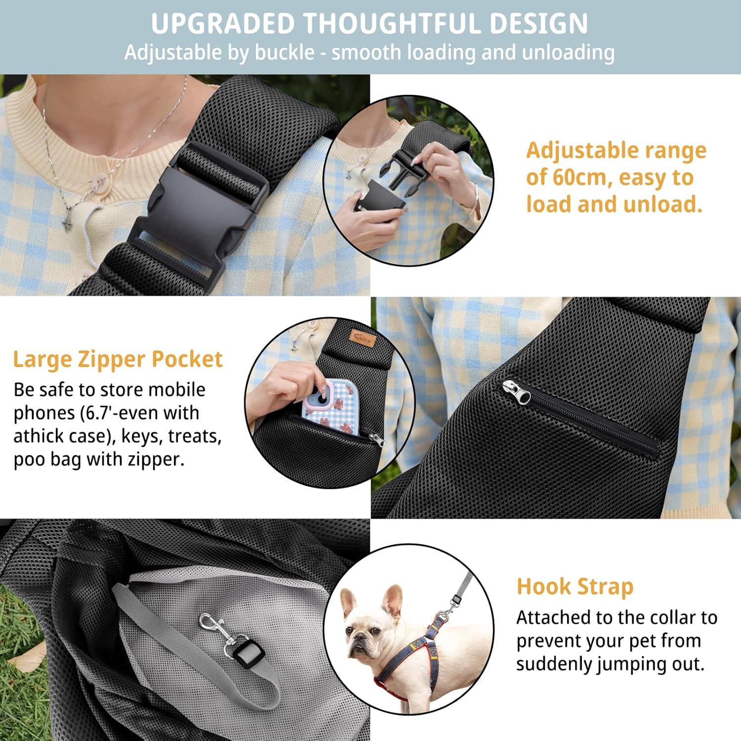 • 🐾Double Protection - The zipper on the inside of the dog bag carrier and the safety belt on the shoulder strap play a double protection role. Fasten the safety hook on the pet's collar to prevent the pet from suddenly jumping out of the pet sling bag or accidentally falling, and protect the pet's safety.