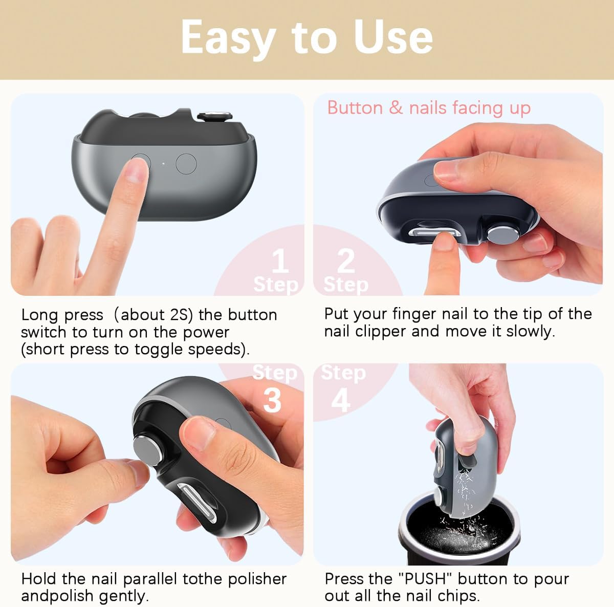 Easy to Use: Simply open the lid, hold the power button (about 2 seconds) to activate, insert nails into the trimming slot (keep nails and device button facing upward), then gently glide the device left and right to trim. Avoid lingering on one area to prevent over-trimming. Compared to traditional clippers, our electric nail trimmer makes grooming effortless, smoother, and completely painless.