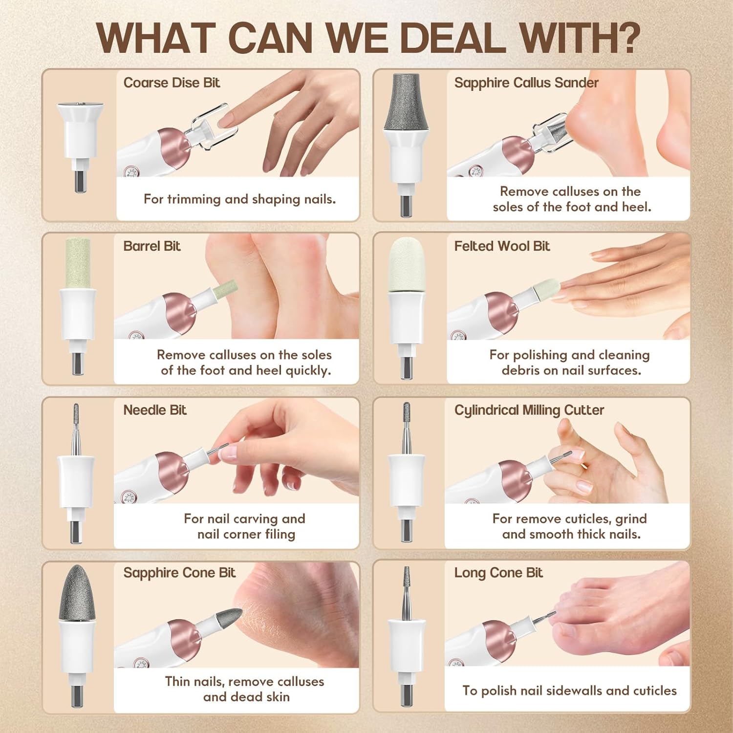 Powerful and Practical: With an upgraded motor for more power, effective heat dissipation and low vibration, the electric nail grinder delivers a more comfortable and effective experience. it's not only a manicure kit for women but also a practical pedicure tool for feet and a toe nail grinder kit for thick nails.