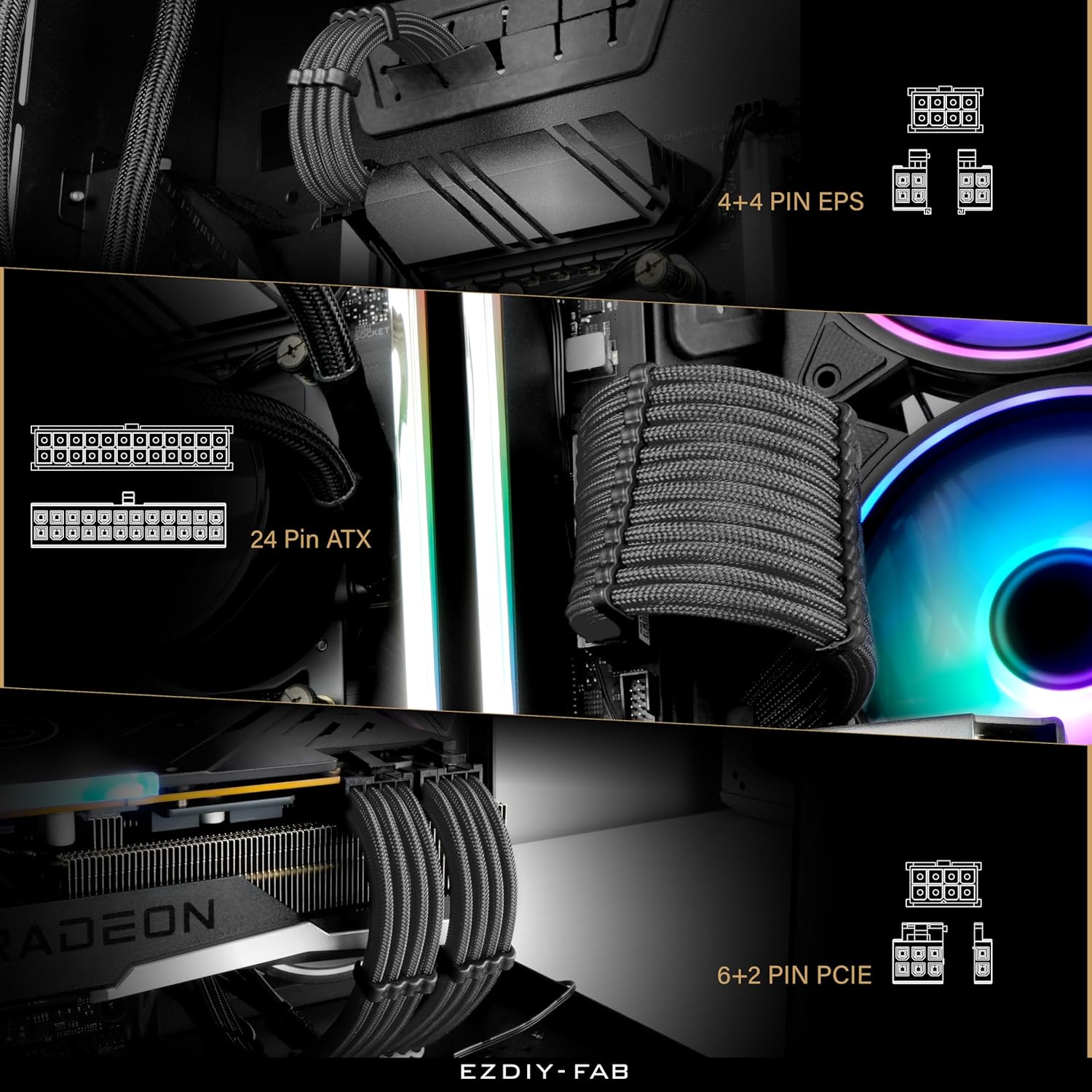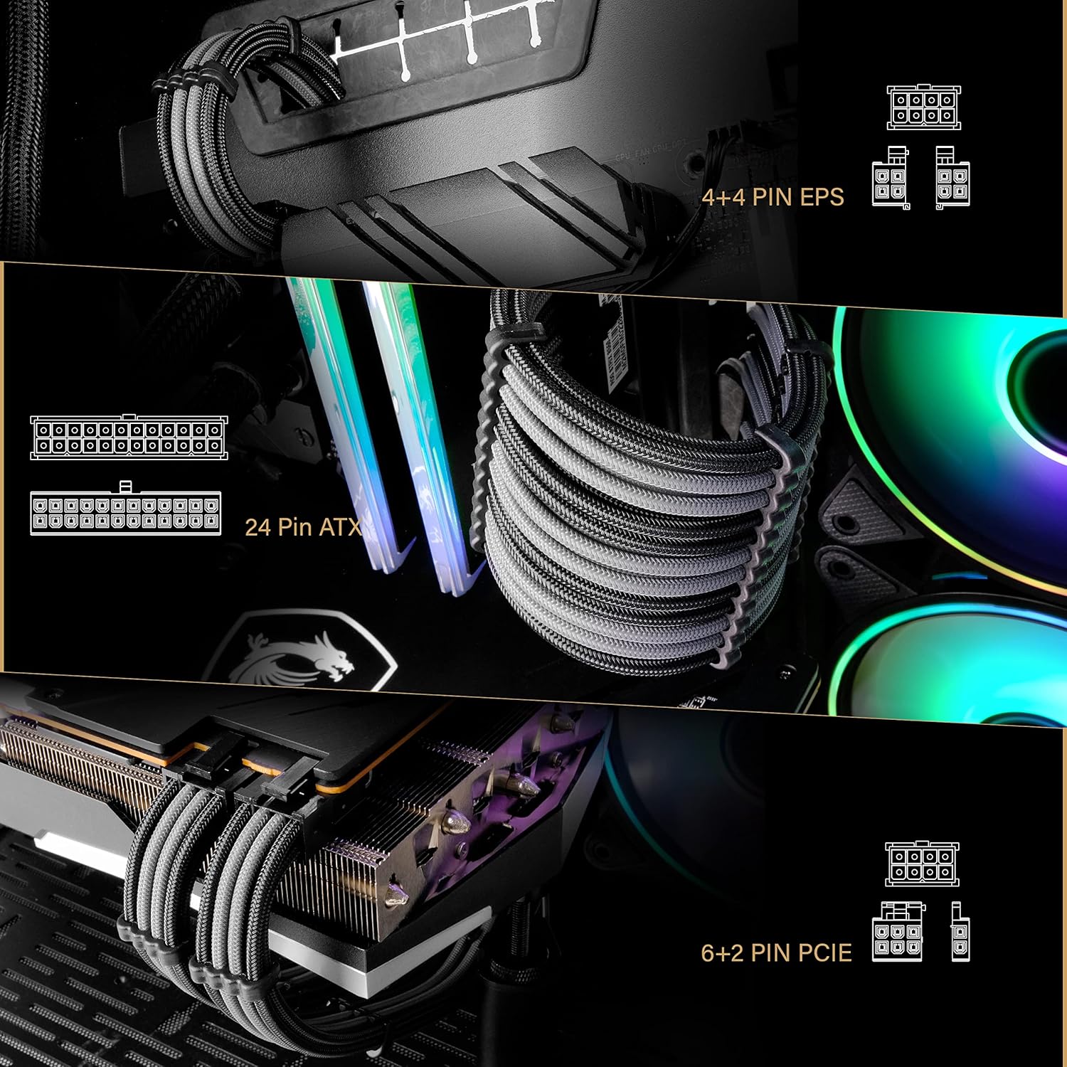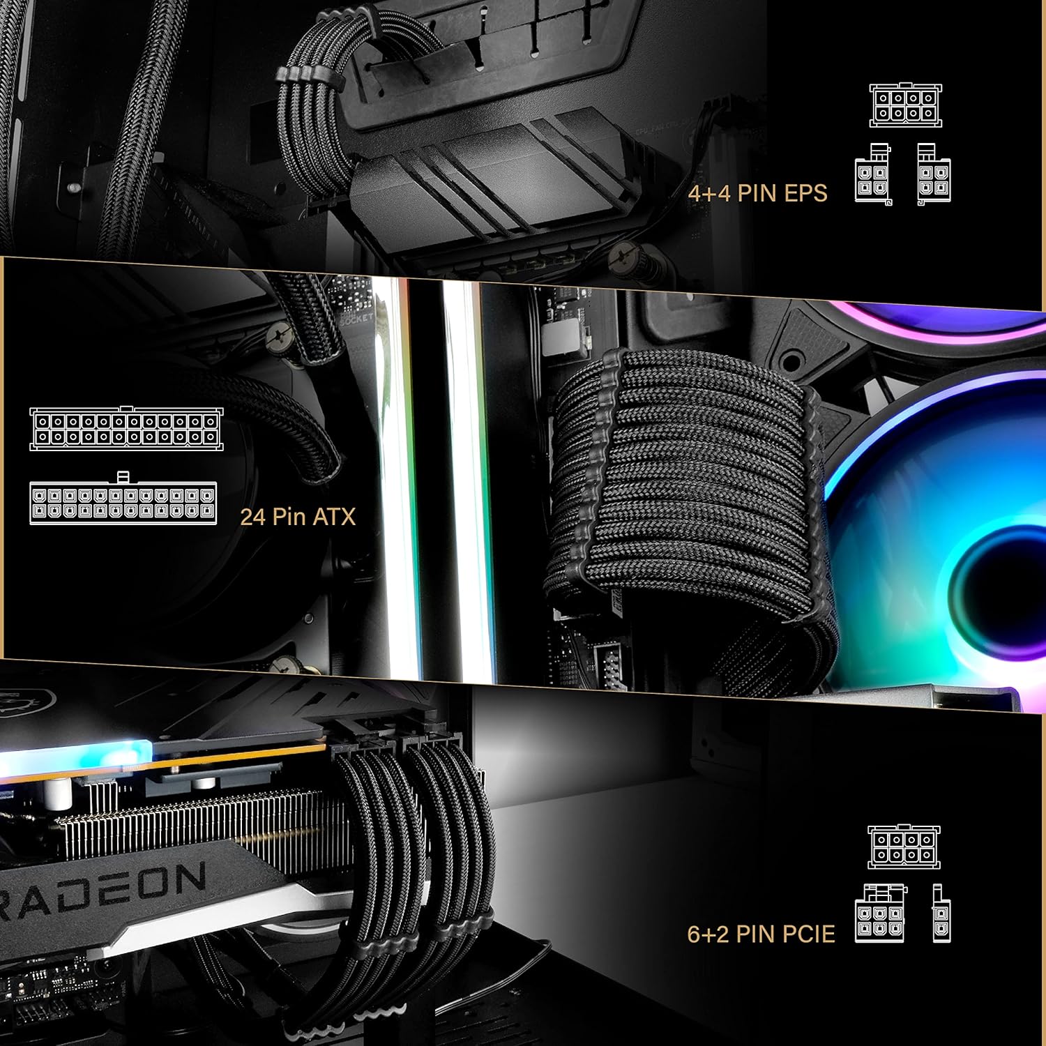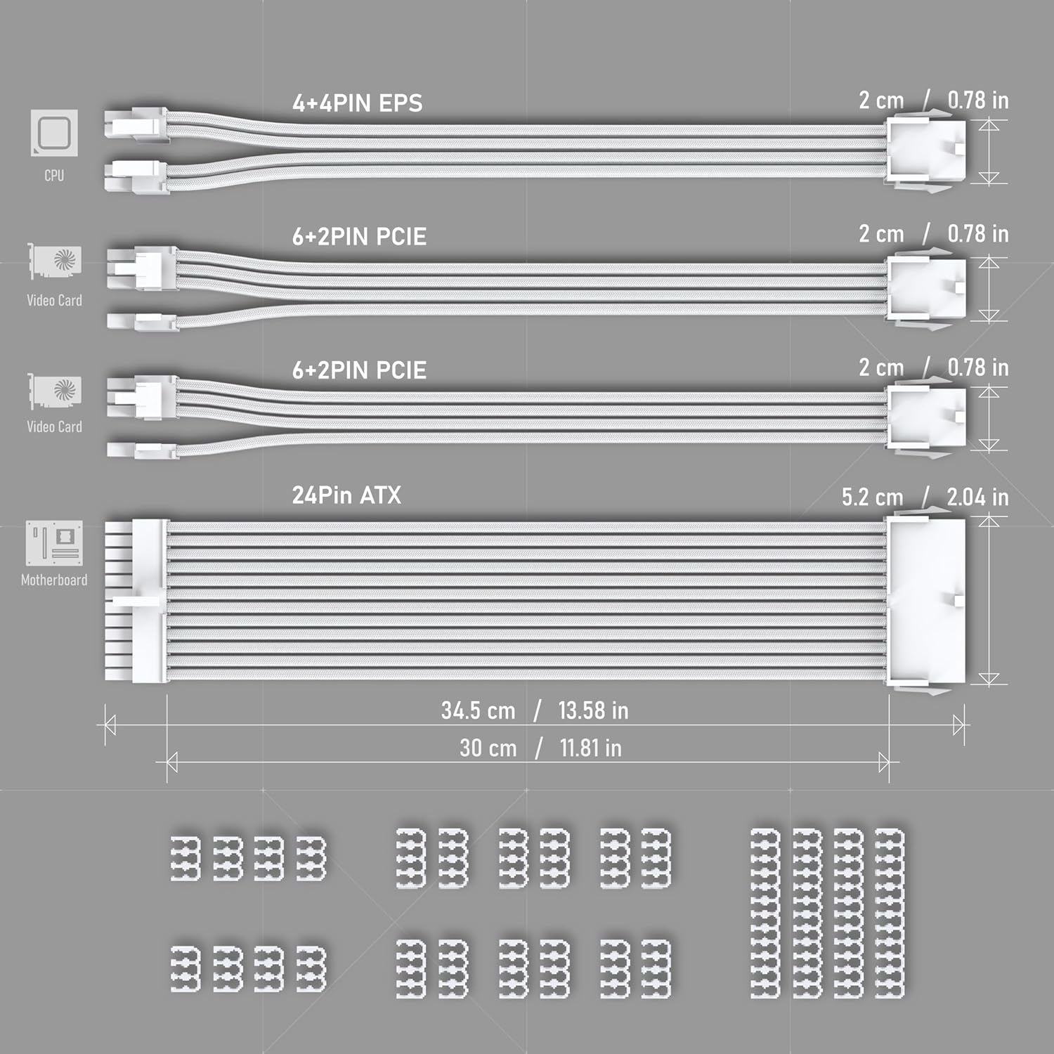 PACKAGE LIST: 1x 24-pin ATX Extension Cable; 1x 8-pin to (4+4)pin EPS Cable; 2x 8-pin to (6+2)pin PCI-e Cable; cable combs included.