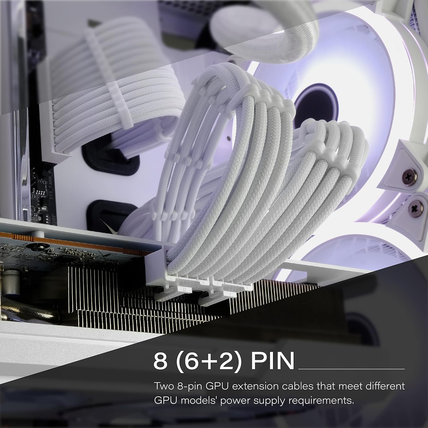 2x 8-Pin to 6+2-Pin GPU power cables bundled in one package. Suitable for both 6-Pin or 8-Pin GPU configurations. Also includes 24-Pin motherboard power and 4+4-Pin CPU power cables.