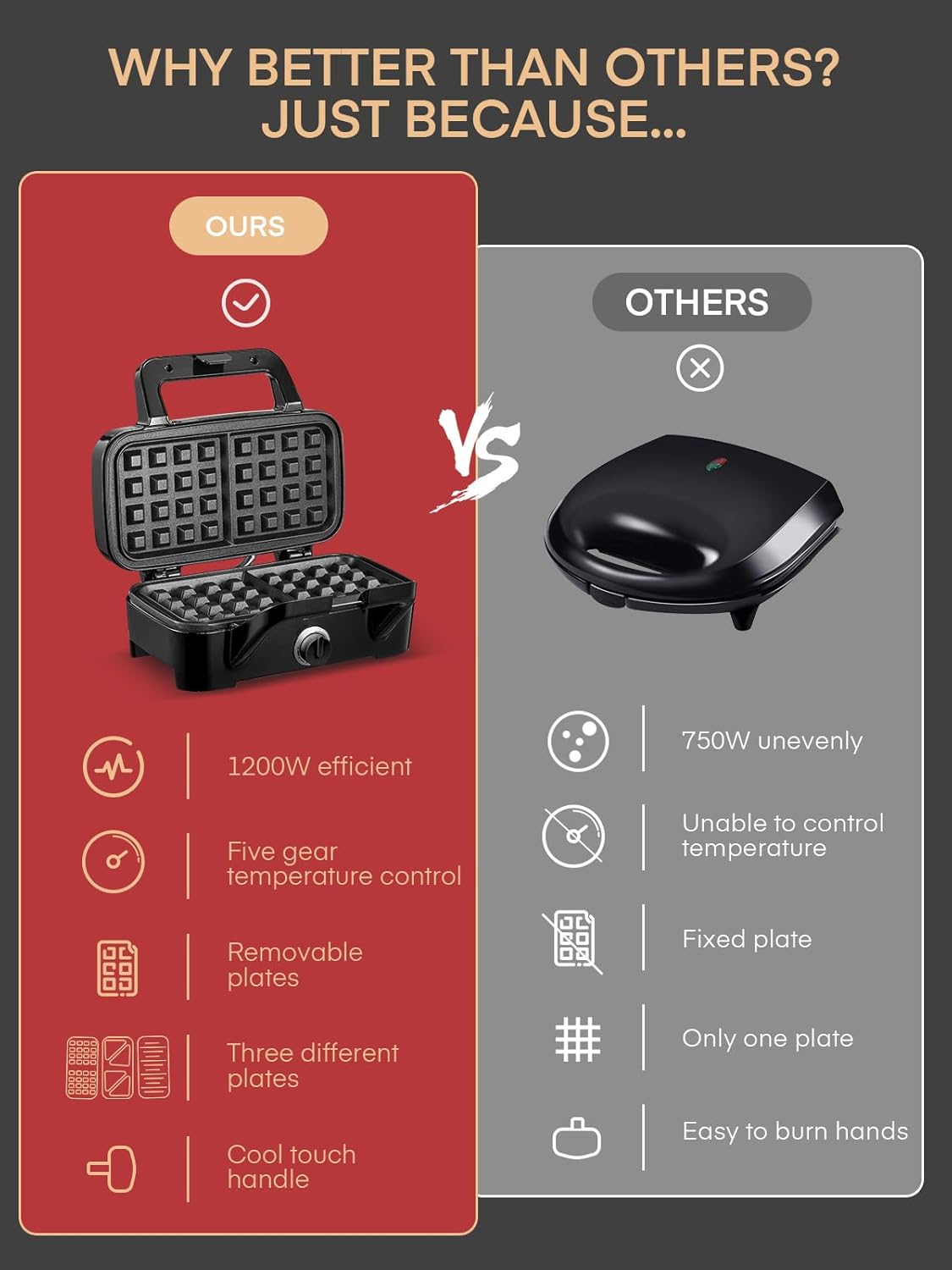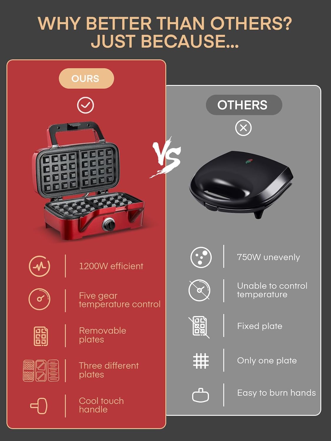 - 【10 Minutes High-efficiency Baking】1200W powerful power heats faster than most waffle makers. Preheating can be completed in 3-4 minutes, can be quickly cooked in 5 minutes. 2 waffles, 4 pcs of sandwich, or 1 pcs of steak could be cooked at one time. Allows you enjoy your delicious more easily, super fitted for your family.