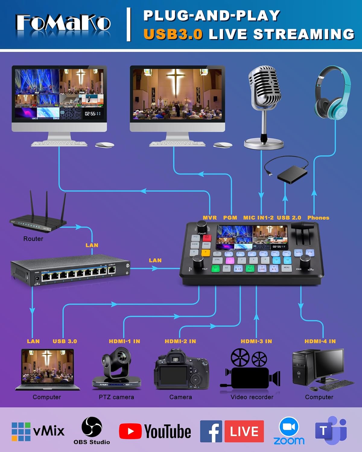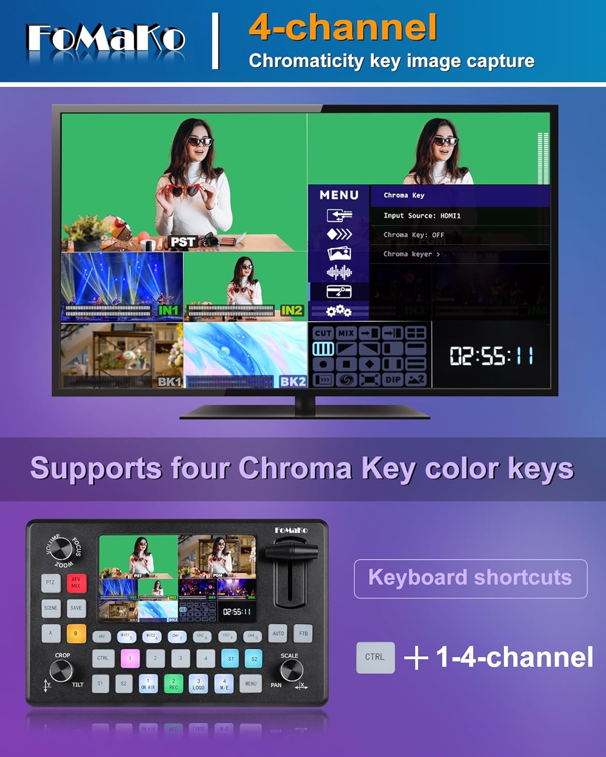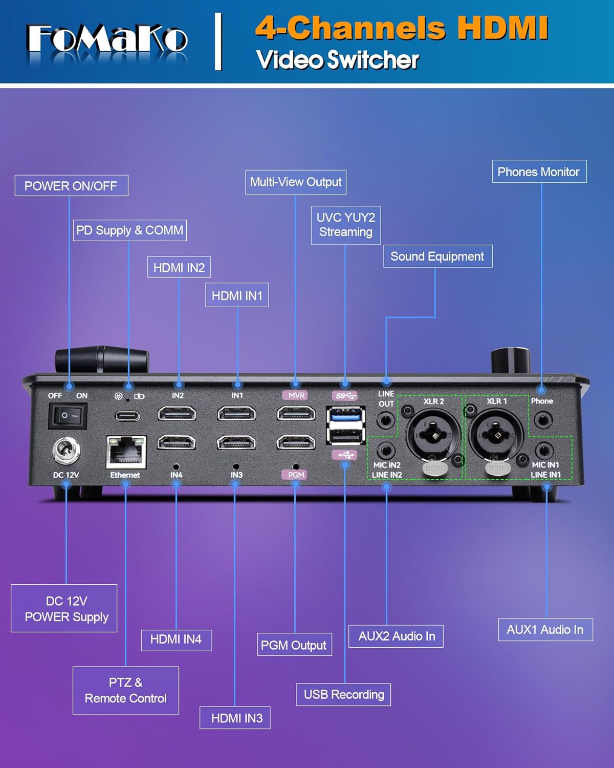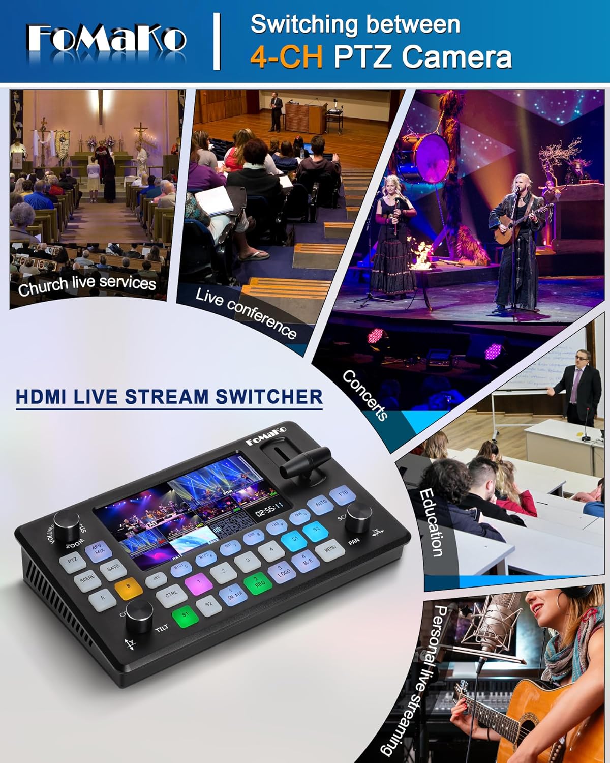 FoMaKo Video Mixer Switcher integrating encoder, switcher, monitor, and USB recorder. Perfect for Worship, Weddings/Funerals, Sport, Events, Corporate, Education, and More. Supports up to 1080P 60FPS, Important: this item Does not support 4K output.
