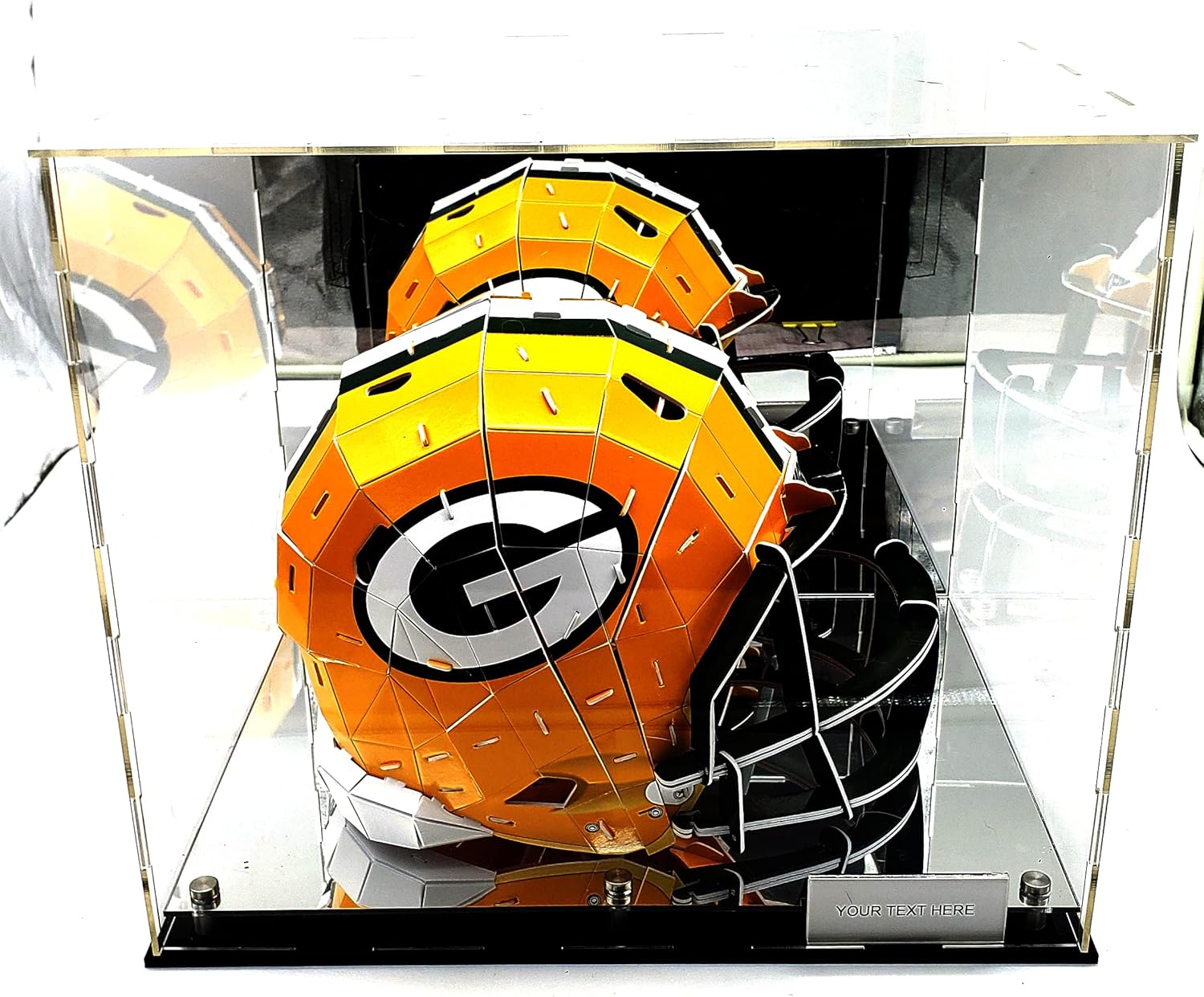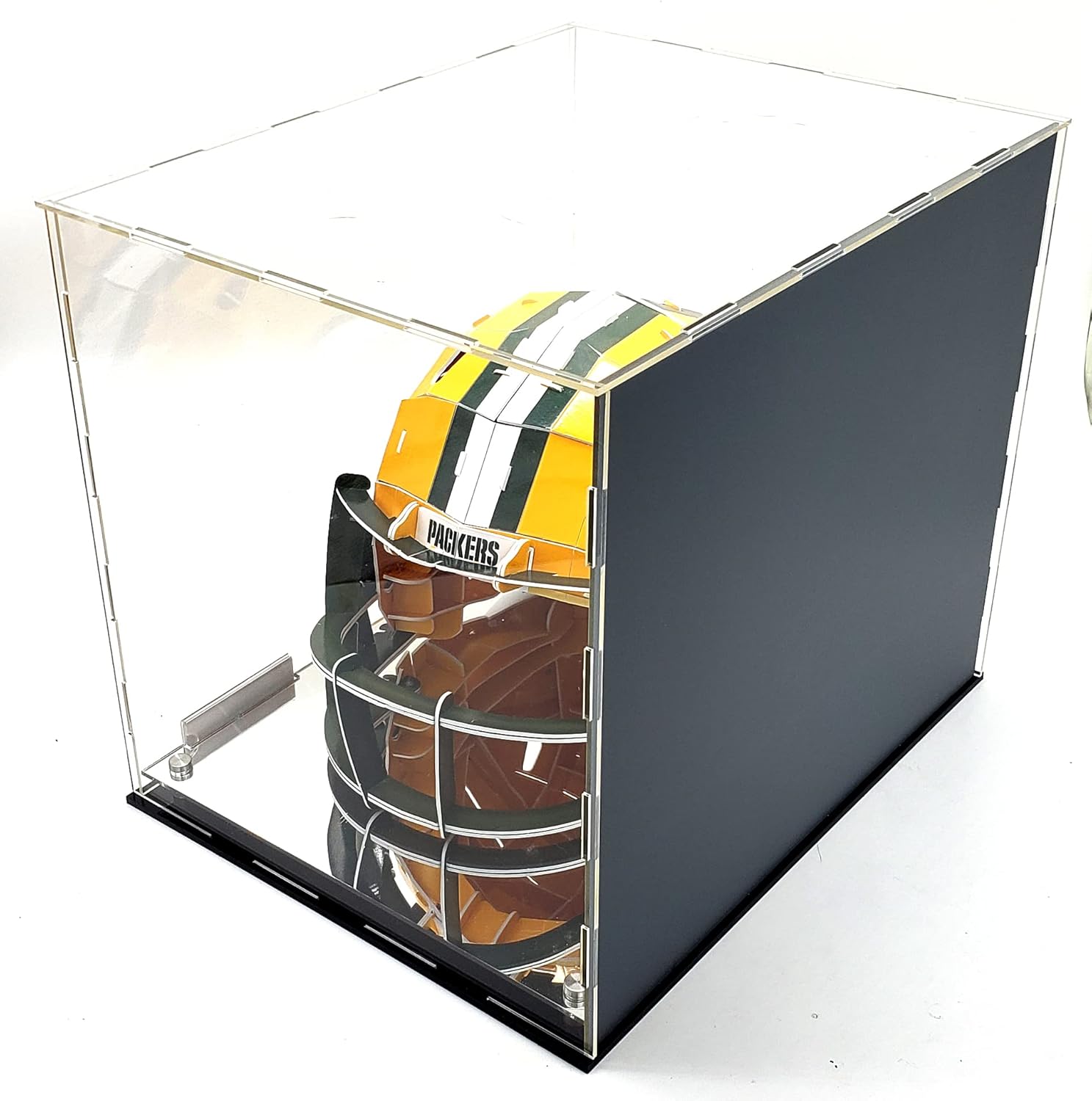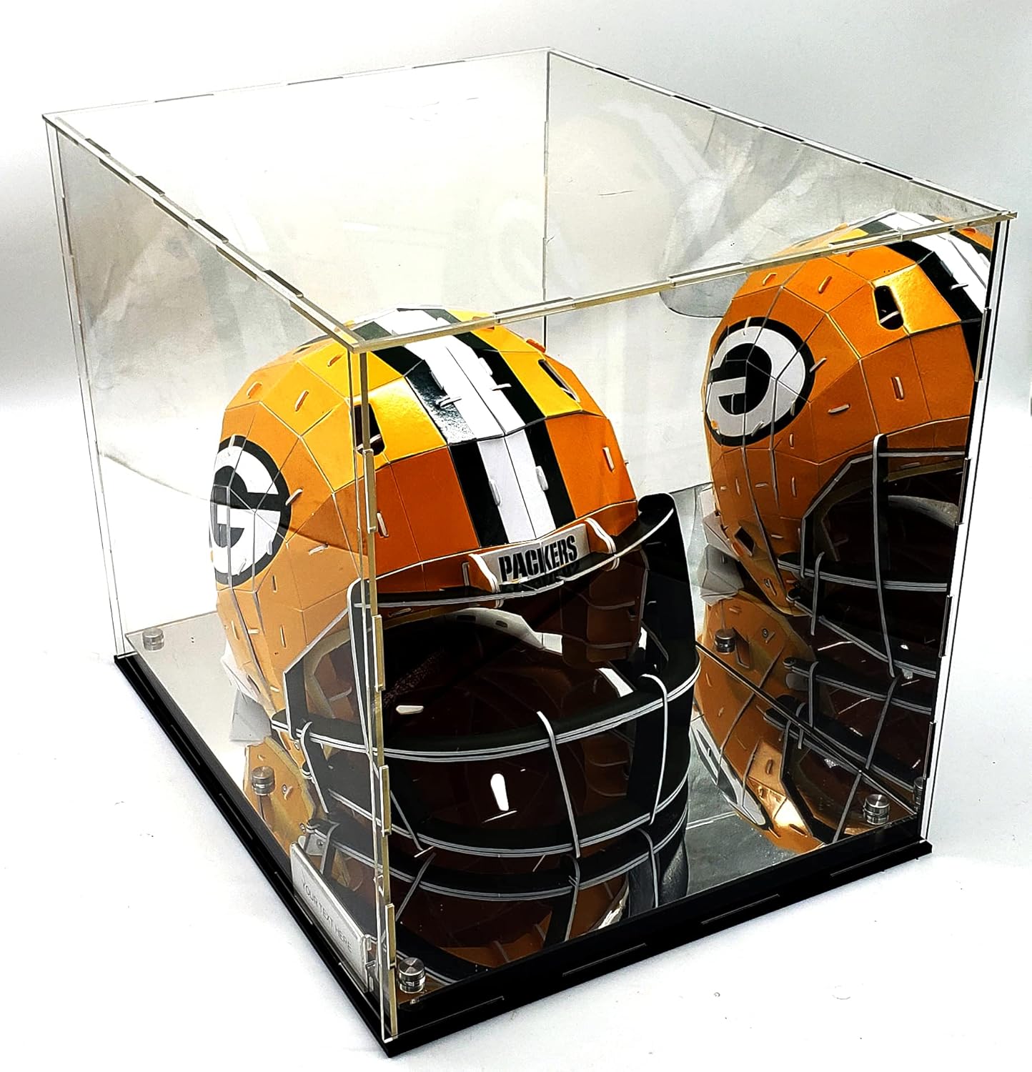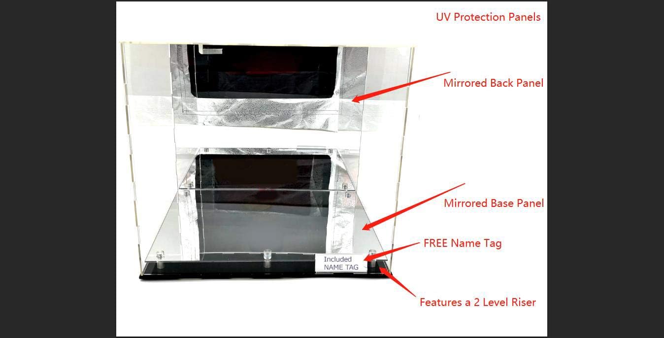 Full Size Helmet Acrylic Display Case Showcase Box UV Protection (Helmet) Included are mirco fiber gloves & Name Plate/Tag Holder. NOTE: Some Light Assembly is required for the acrylic panels. Dimensions : 15 inch Long // 12 inch Width,13 inches Height (Platform is .75 inch tall). Please contact us if for any reason you're not completely happy with your purchase- if it breaks, if it's damaged in shipping, or even if you change your mind - simply let us know and we will either replace it or refund your money, your choice!