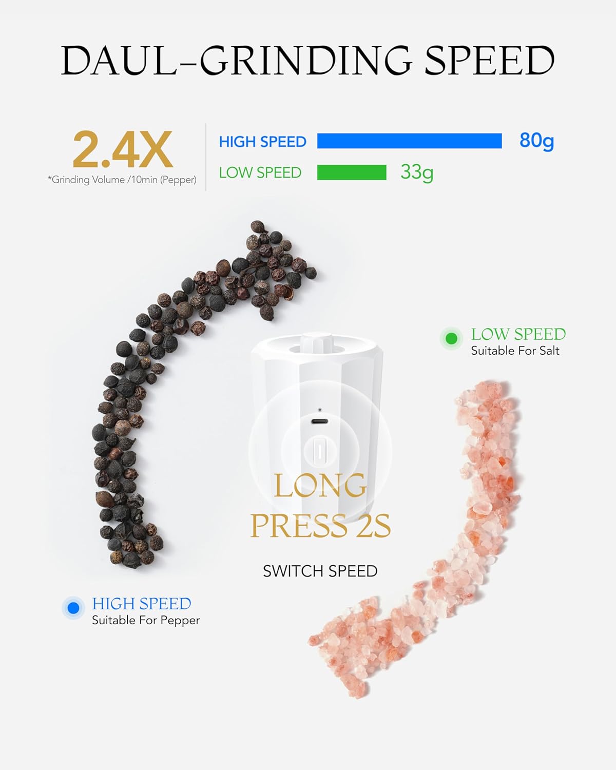 - 800 mAh USB Charging & Multi-function Indicator Light – Convenient USB charging ensures your salt and pepper grinder set is always ready to use. The indicator light shows blue (fast speed), green (slow speed or charging complete), and red (charging or low battery), providing clear feedback on the grinder's status