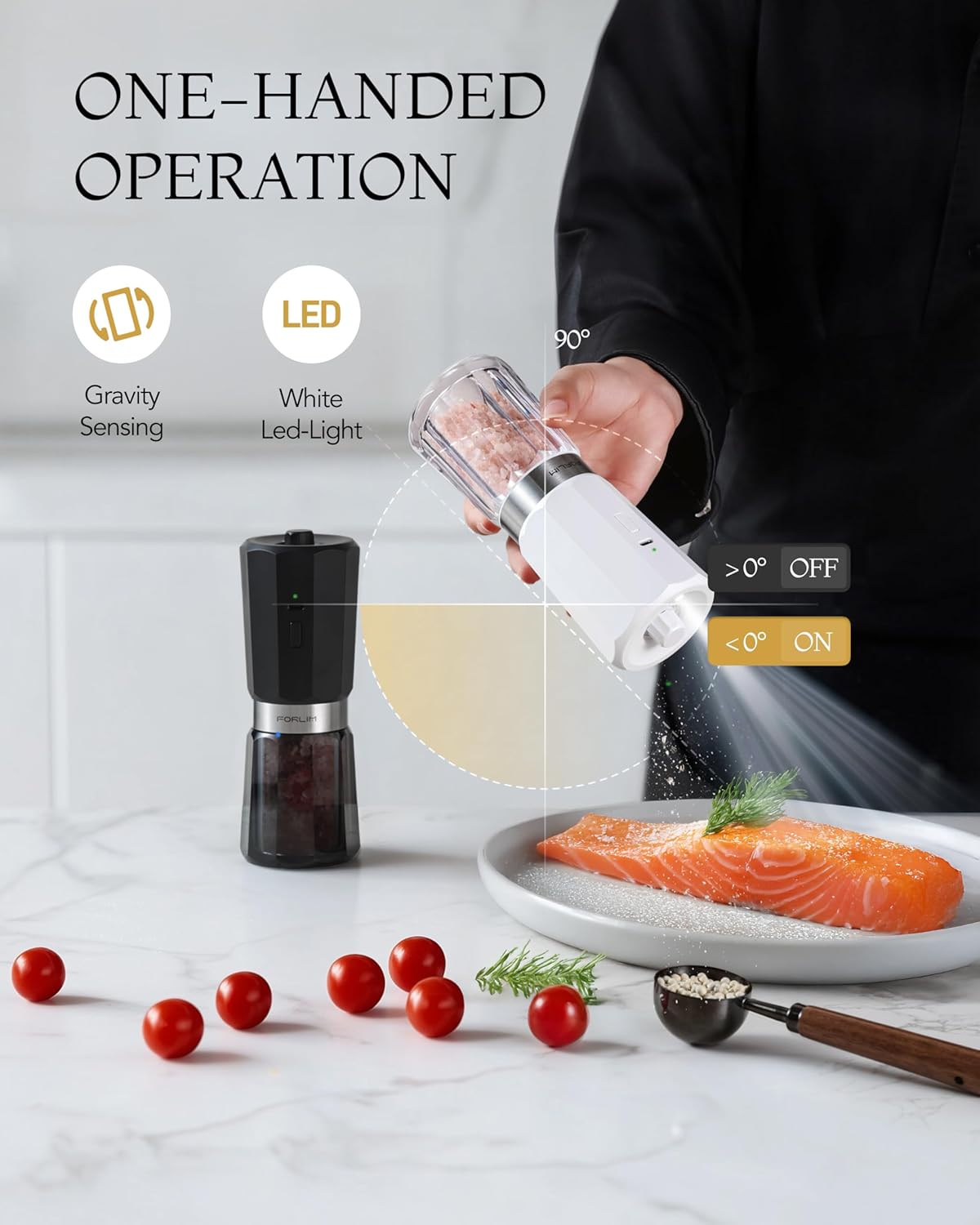 - Gravitation Sensor Technology – Featuring innovative gravitation sensing technology, this pepper mill allows you to grind spices effortlessly with just one hand. No need to loog press button—simply tilt the grinder to start, freeing up your other hand for a more convenient cooking experience