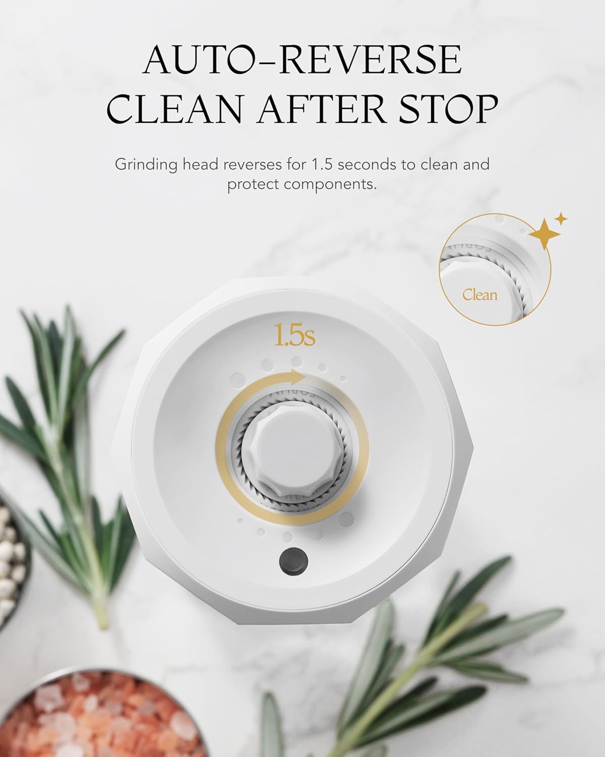 - Reverse Cleaning Function – This unique automatic reverse cleaning function helps clear out leftover powder in the ceramic grinding core during use, preventing blockages and extending the motor's lifespan. Keep your automatic salt and pepper grinder set clean and efficient with ease