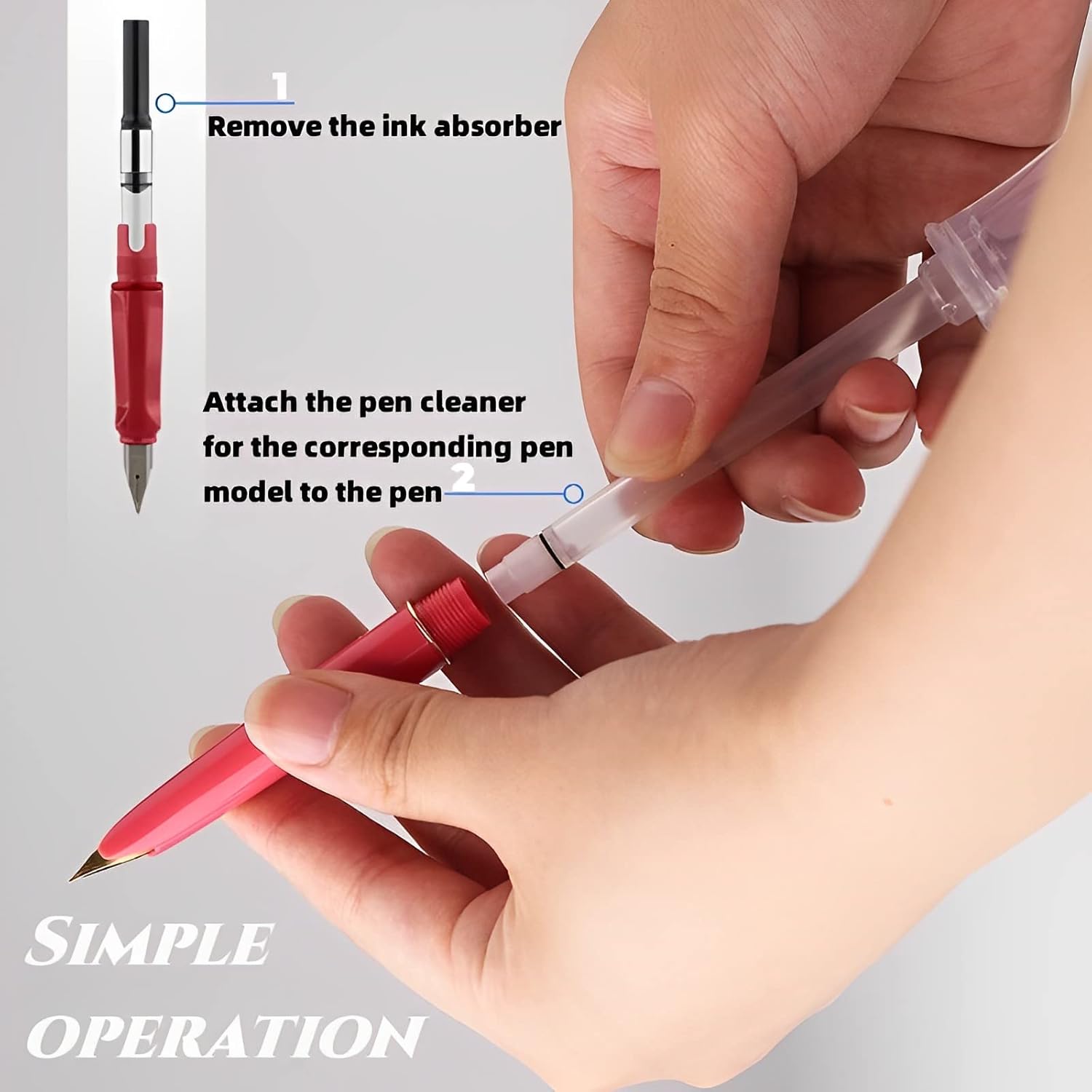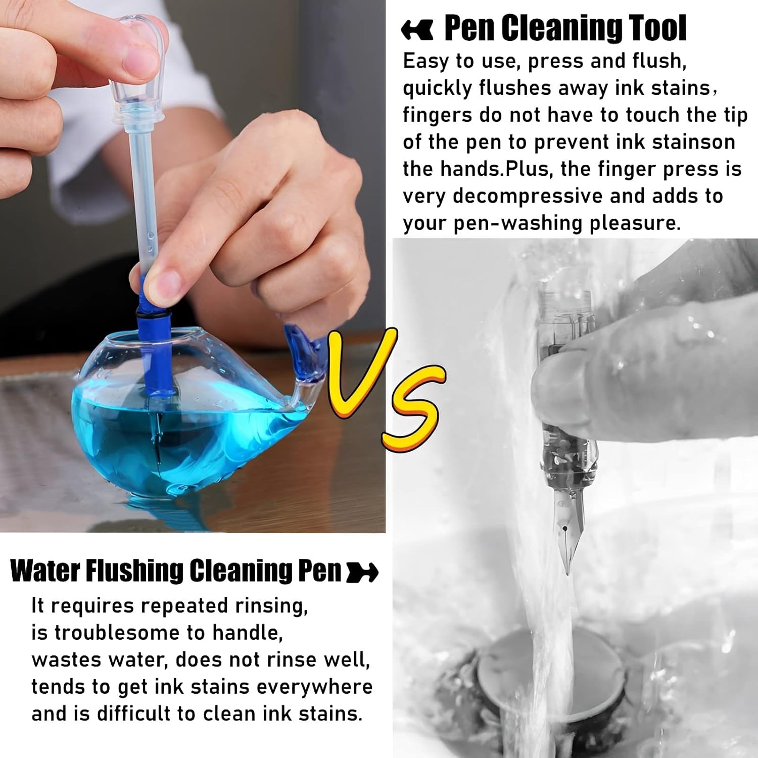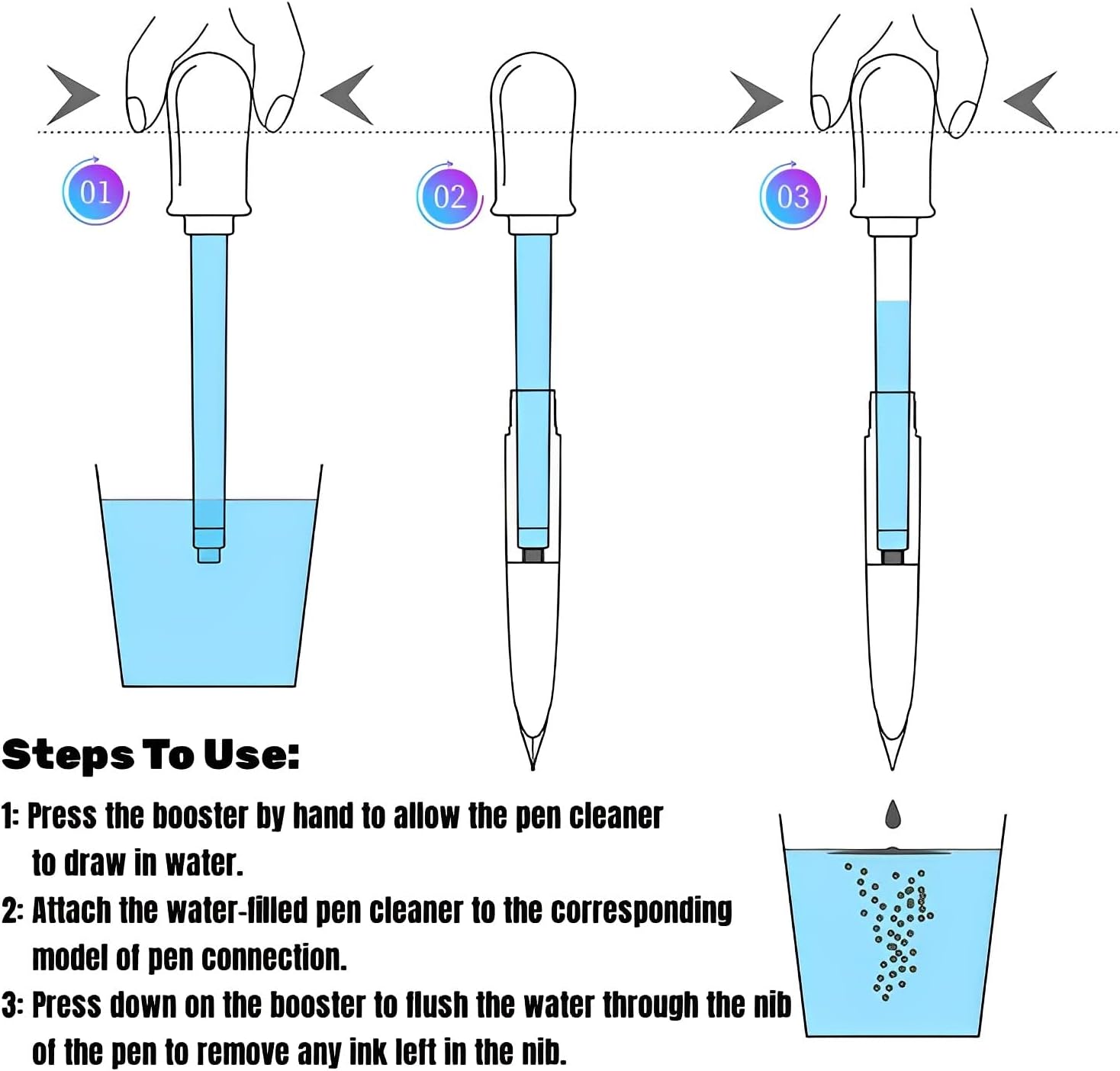 - 【Easy to Install and Operate】: the Pen cleaning tool first draws in clean water, find the corresponding model of pen, remove the ink tube, install the pen cleaning tool with water, press the top to let the water rush into the head of the pen, then the ink stain follows the water out of the nib, cleaning very clean, easy to operate, no residual ink stains on fingers or countertops.