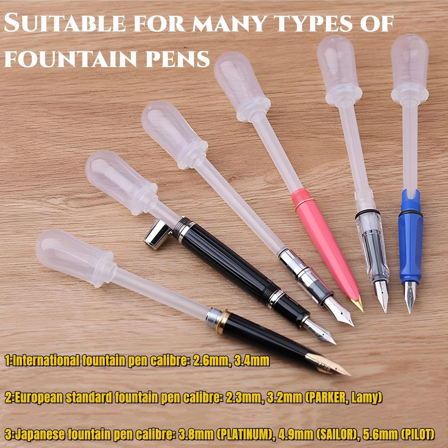 - 【Wide Compatibility】:Our fountain pen cleaners are designed according to the type of fountain pen ink capsul,Suitable for:International fountain pen calibre: 2.6mm, 3.4mm.European standard fountain pen calibre: 2.3mm, 3.2mm (PARKER, Lamy).Japanese fountain pen calibre: 3.8mm (PLATINUM), 4.9mm (SAILOR), 5.6mm (PILOT).Please measure the caliber of the fountain pen ink capsule before placing an order for the corresponding calibre model