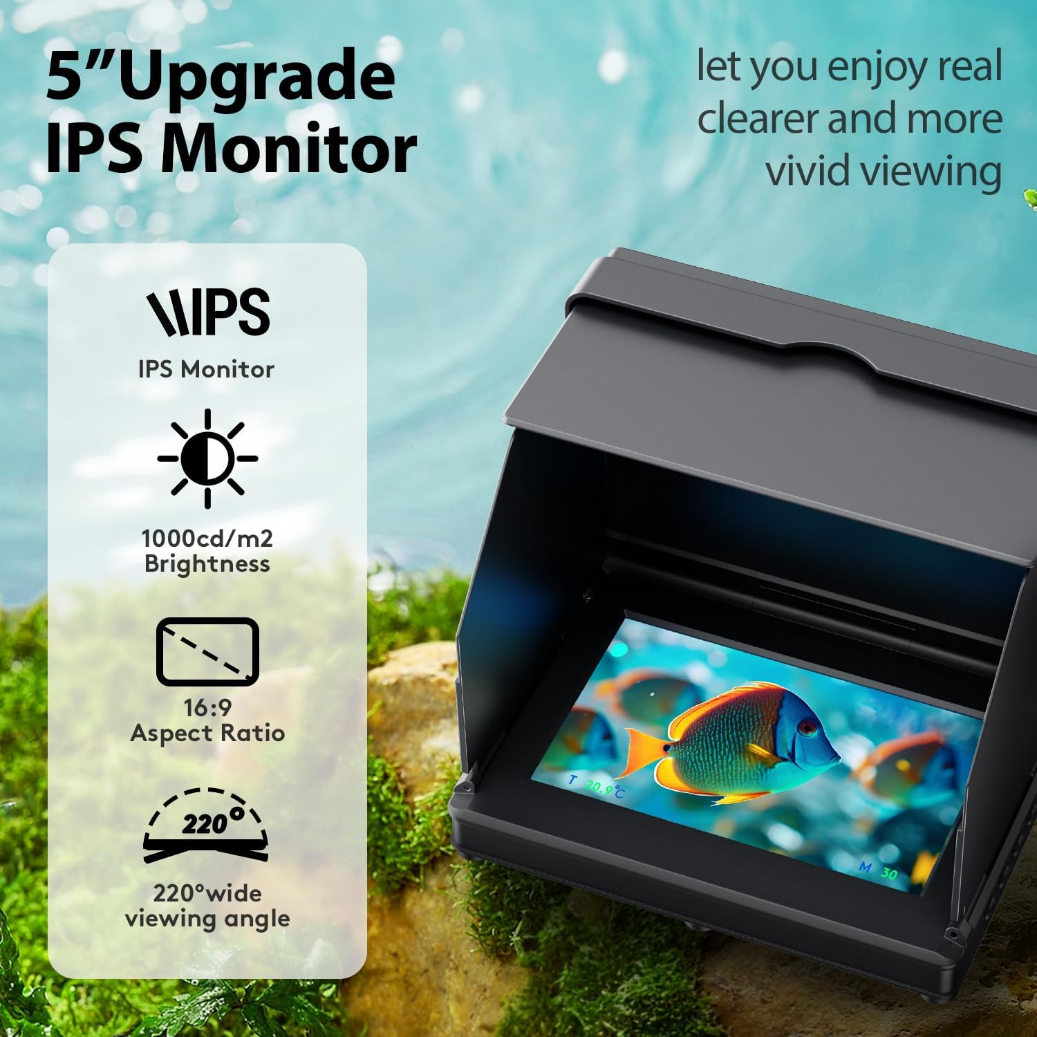 - See More, Catch More-This Unique Design Will Not Disturb The Fish, It Can Lure The Fish Close To.The 5” LCD screen provides a crystal-clear view, helping you find the perfect spot for your next big catch. Ideal for sea, lake, and ice fishing. And Removable Sun-Visor Ideal For Bright ,Environmentsspecially Manufactured 2500tvl Program Chip And 4pcs Ir Lights, Fishes Will Be Seen More Clearly In The Dark Environment.Higher than 1080p display and clarity under murky water