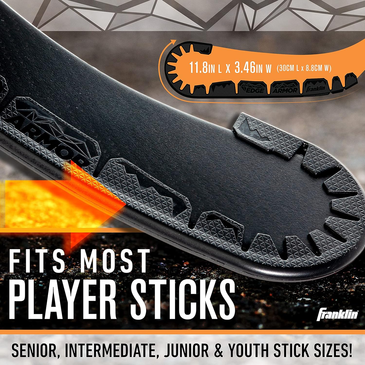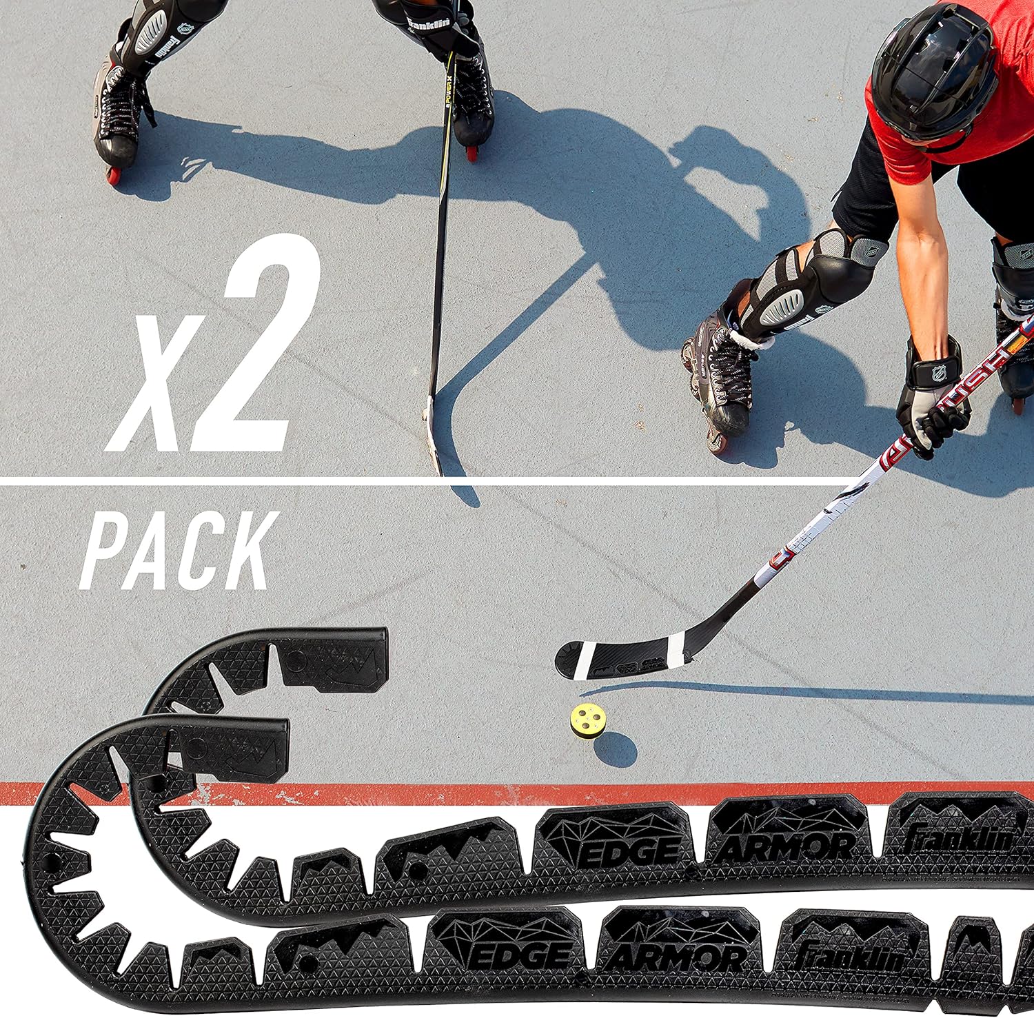 Franklin Sports Edge Armor blade protector is designed to protect your expensive stick blade from the high impacts of the game off the ice! We were tired of having a back up stick that we needed to use for off ice training that was older than the day is long so we made Edge Armor! It is made of specially designed plastic that will protect your blade from the impacts of the game off the ice so you can finally use your high end expensive stick off the ice too! It's easily applied to the blade in 3 simple steps and is lightweight so you can continue to be agile as you play. Players of all ages like to practice their game outside of the rink so we made sure this protector fit senior, intermediate, junior and youth stick sizes! It will fit both right and left handed curves! We love Edge Armor because it's important to practice how you play, which starts with the equipment that you use! It's critical to use your on ice stick off the ice so you are confident come game time which is why this trainer is a must have! This set of 2 is easily secured to any blade and makes for a great gift for any hockey player out there who likes to train off the ice or play games with friends in the street!