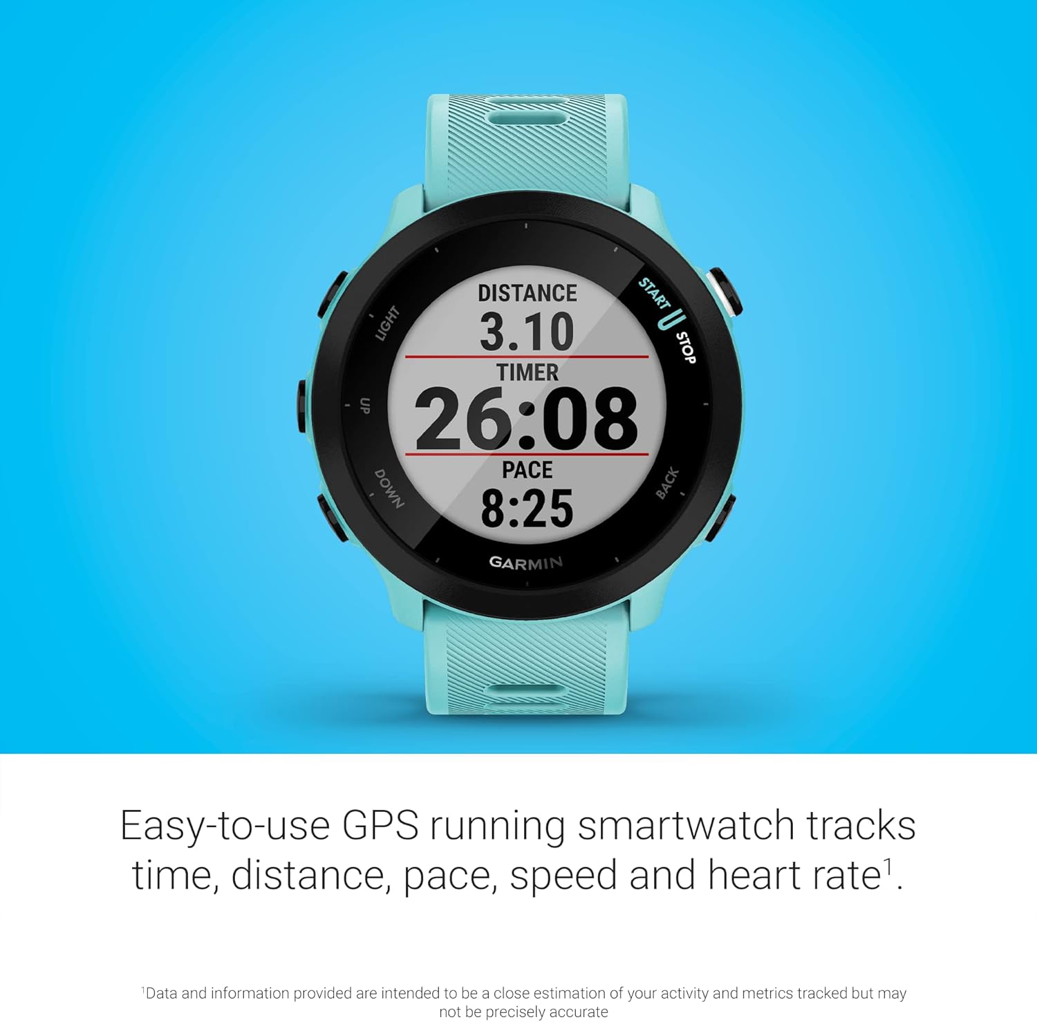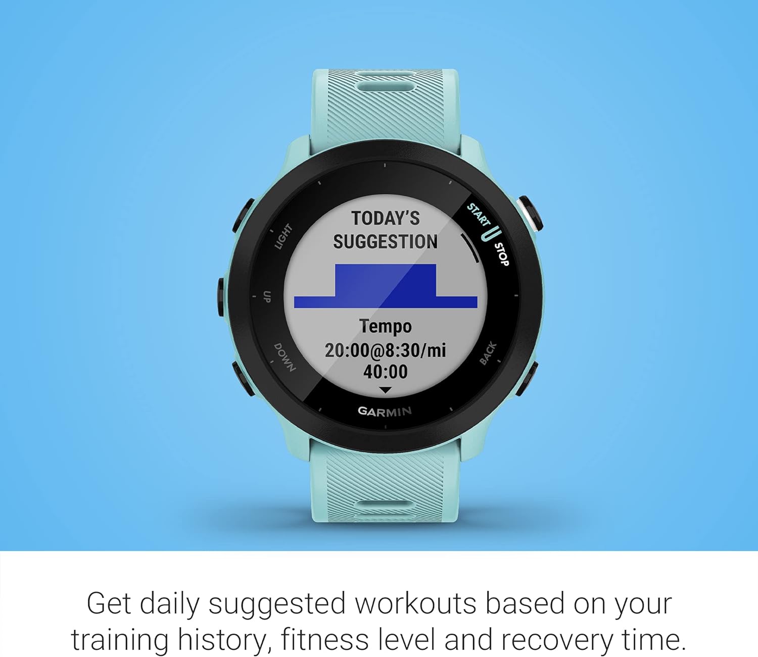 See yourself as a runner. Forerunner® 55 is the GPS running smartwatch that goes beyond pace and heart rate (this is not a medical device) stats. Take the guesswork out of training with personalized guidance and daily suggested workouts based on your training history and fitness level. Change things up with HIIT and breathwork activity profiles. Advanced wellness tracking features, such as all-day respiration monitoring, intensity minutes and more, put you in tune with your body. Get more runs in between charges, thanks to this watch’s long battery life, and make it truly your own by downloading watch faces, apps and more from the Connect IQ™ Store (requires Garmin Connect™ app and Connect IQ™ app loaded on a compatible smartphone).