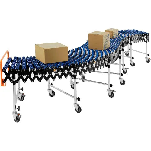 Instantly set up conveyor lines for shipping, receiving, assembly and packaging areas. Flexible, portable gravity conveyor expands from 6'2" to 24'8". Rugged 5/16" steel axles and self-tracking skate wheels with enclosed steel ball bearings offer smooth material flow. 175 lbs. per foot capacity. 1-1/4" (compressed) to 4" (expanded) axle centers for a 7" minimum package size. Seven zinc plated telescopic legs with 4" thermoplastic rubber swivel casters adjust independently from 31-3/4" to 40-1/2" to achieve maximum gravity flow and create banked curves. Units bend around a 27" radius. End legs have locking brakes. Includes convenient box stop and hook couplers to connect additional conveyors. Assembles easily. 1 Year Limited Warranty.