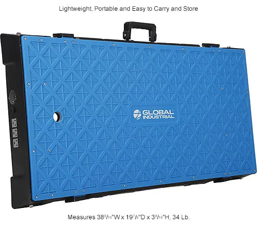 Introducing the Global Industrial™ 4-in-1 Multi-Purpose Portable Workbench With Power Strip. This unique product is more than just a workbench — it's a workshop all-in-one. Designed to be sturdy, portable, and powerful, it's ideal for professional contractors, mechanics, and homeowners looking to perform everything from small DIY projects to restoration and remolding. The large, non-slip work surface includes a built-in ruler, cutting groove, drill hole guide, rope connector hole, and durable steel hammer surface. ETL/cETL listed. 1 Year Limited Warranty. Dimensions: Folding Size: 38-9/16"W x 19-7/8"D x 3-9/16"H; Work Table: 53"W x 32-9/32"D x 30-1/2"H; Scaffold: 46"W x 26-9/16"D x 18-1/2"H; Creeper/Dolly: 38-9/16"W x 19-7/8"D x 4-3/4"H".