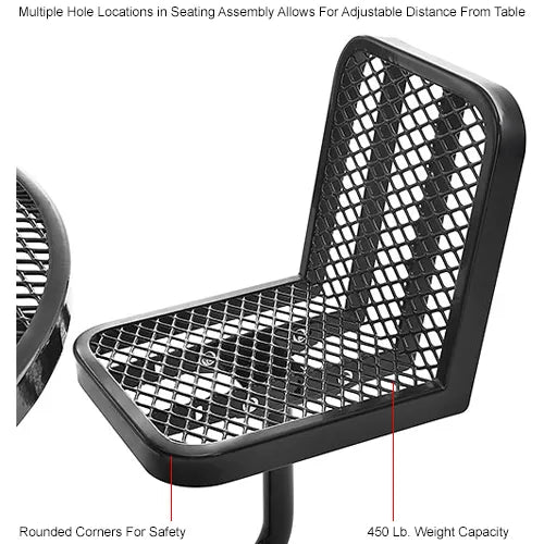The black Global Industrial™ Carousel Picnic Table is ideal for high-traffic seating areas in parks, schools, patios, pools and more. Each chair is spaced 3-feet apart with adjustments for seat distance from the table, ensuring comfortable access and seating for up to six. This outdoor picnic table is made of heavy-gauge metal mesh with a durable high-gloss thermoplastic coating on the chairs and table top that stays cool to the touch even in the sun.