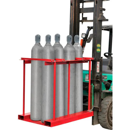 Forkliftable Cylinder Caddies are made of heavy duty steel for long lasting durability. Features a forkliftable design allowing for easy storage and transport. Holds cylinders up to 9" in diameter. 1500 lb. load capacity. Hinged retainer bars secure cylinders in place during handling. Designed for convenient loading and unloading. Cylinders roll on or off at floor level without lifting or rolling up a ramp. For use with fork width up to 5.5". Dissipative ground chain included for security.