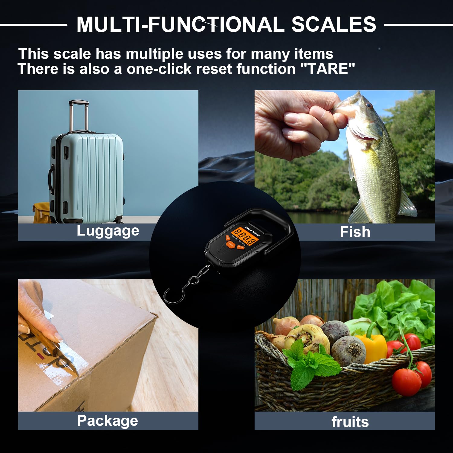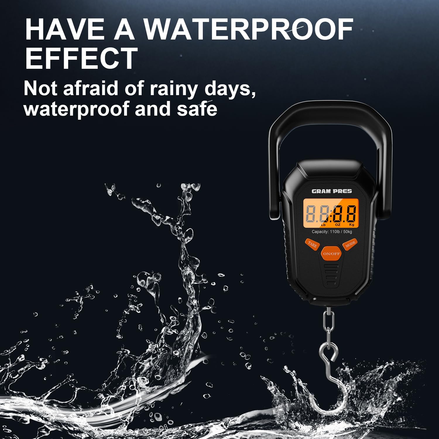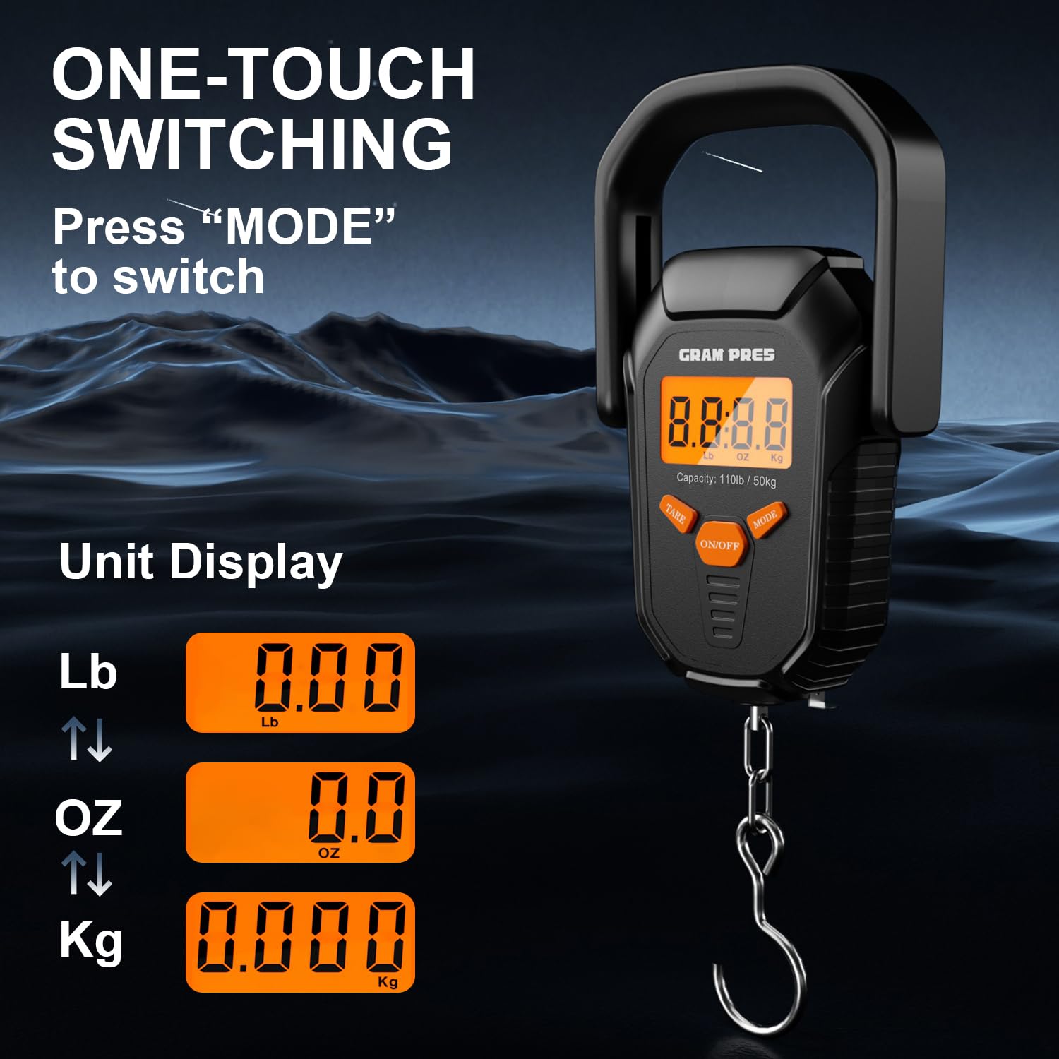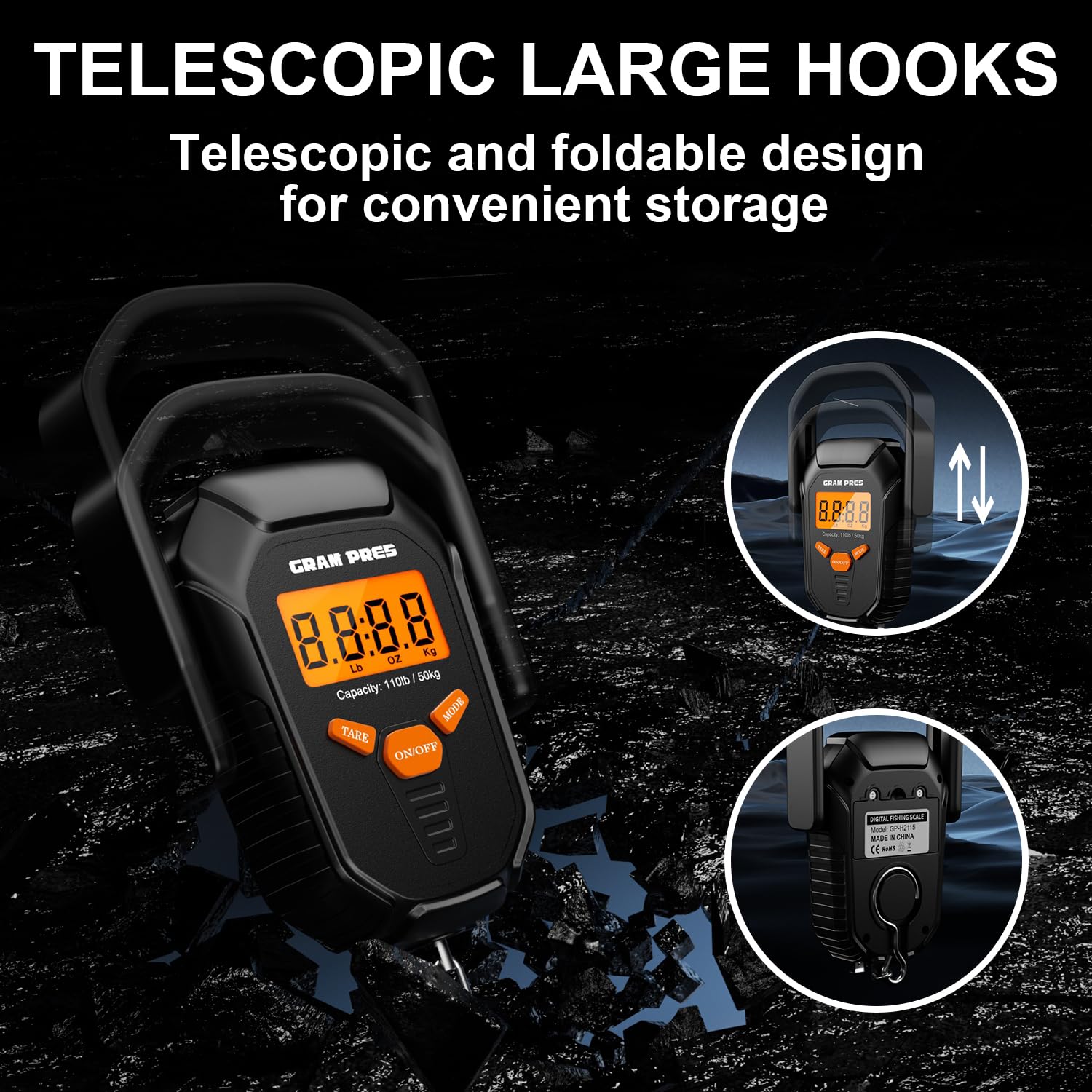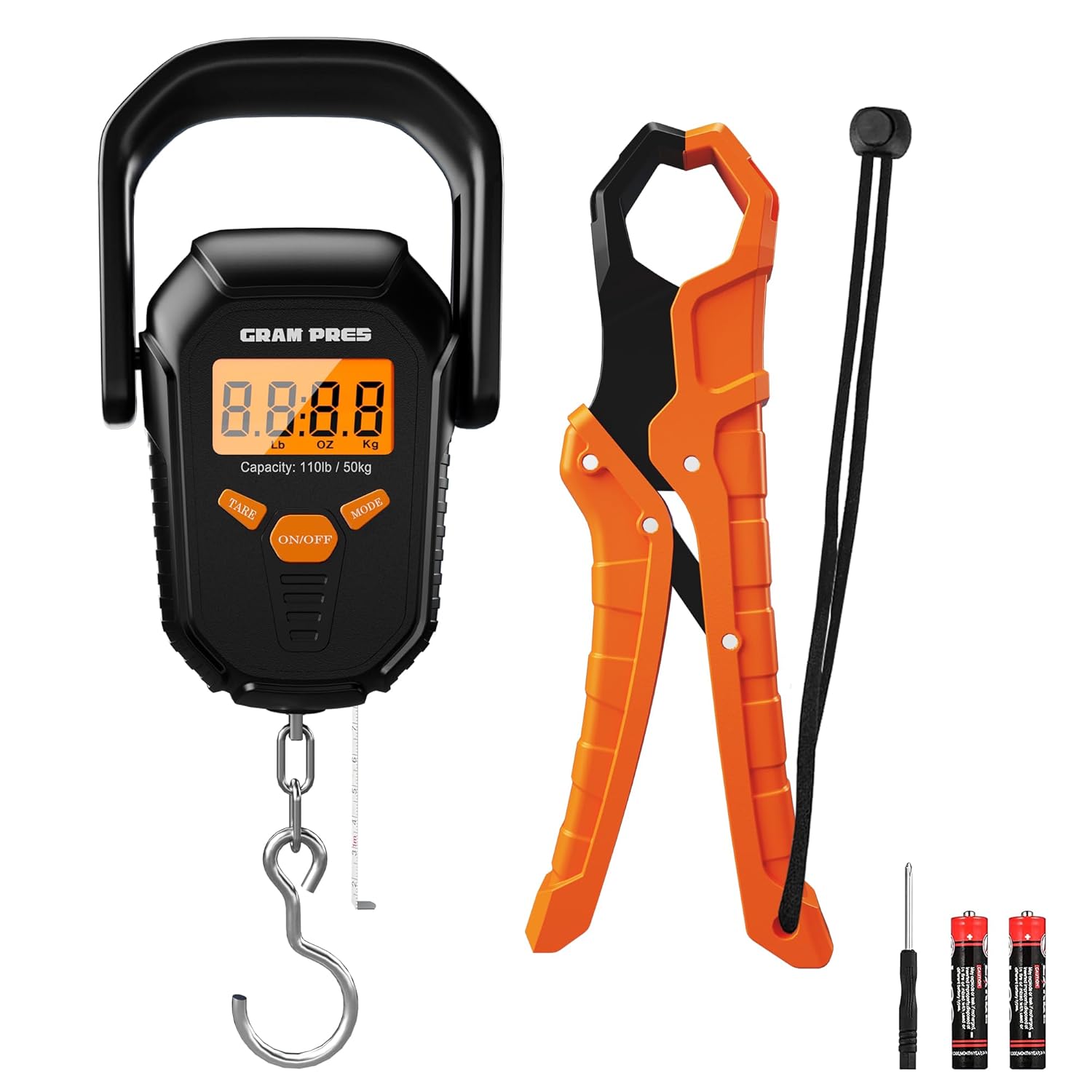 GRAM PRES Fish Scale 110lb/50kg,Digital Fishing Scale with Ruler,Electronic Portable Hanging Luggage Weight Scale with Hook and Fish Lip Gripper,Lb/oz/Kg Mode, Batteries Included