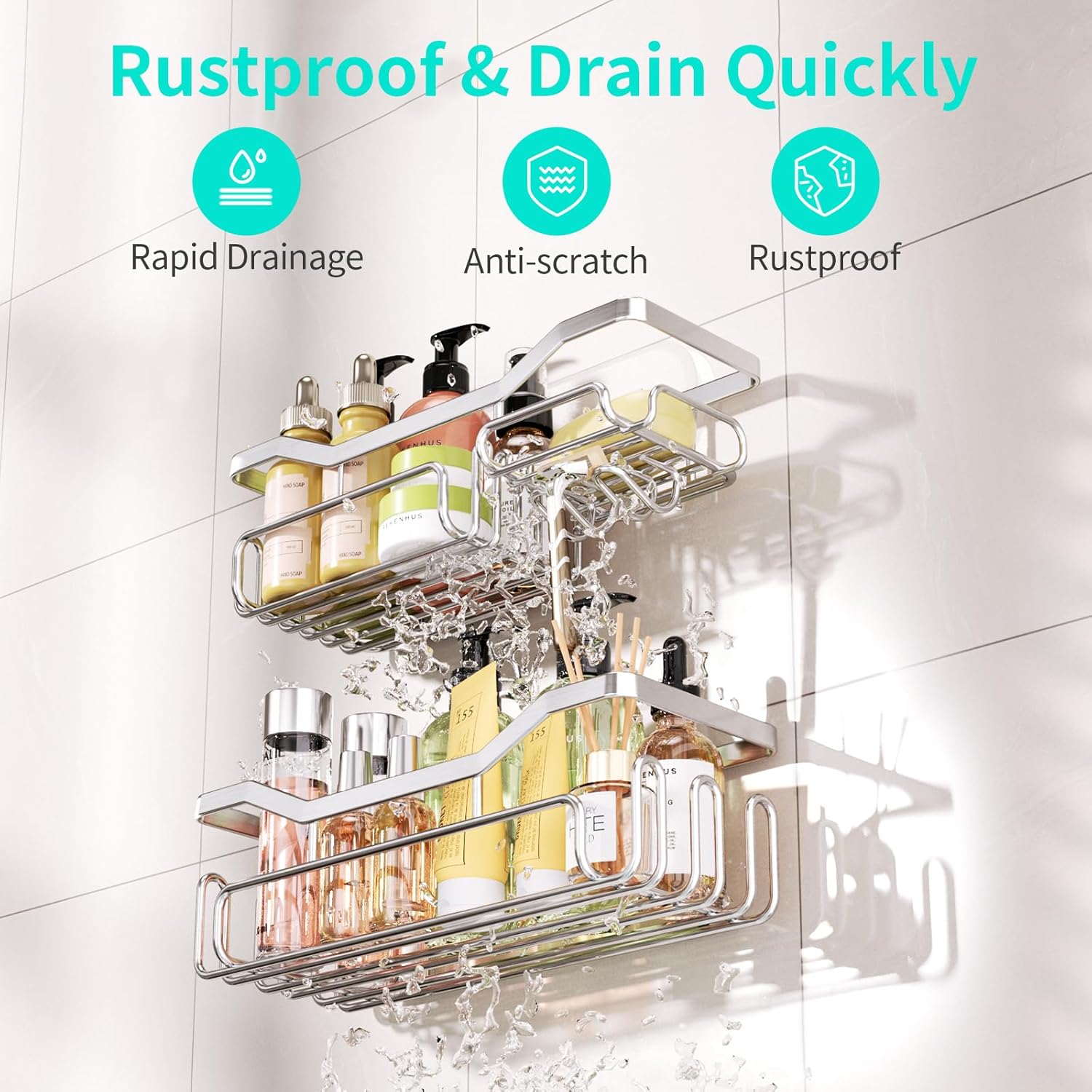 - [Easy To Install]: The self adhesive shower shelves comes with transparent traceless glue is more durable and stronger than suction cup. No drilling or wall damage. The adhesive shower caddy also comes with an extra strip of hooks