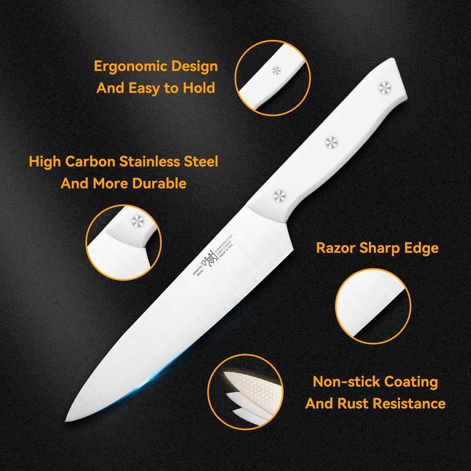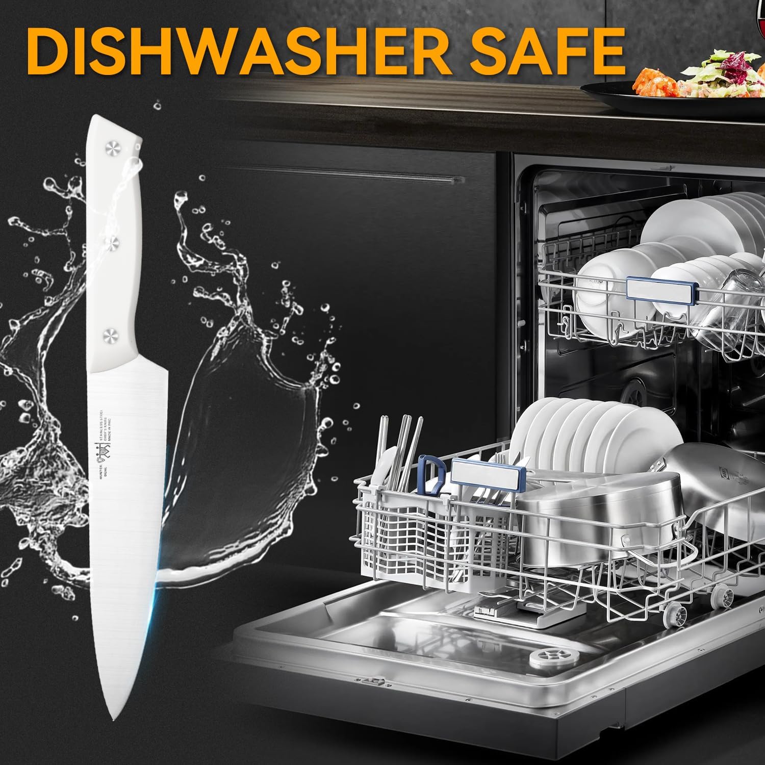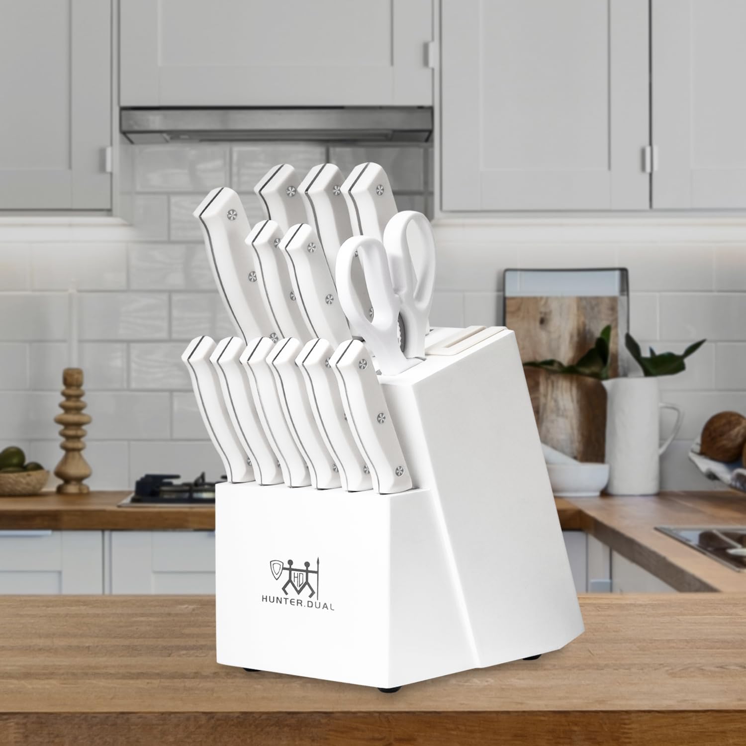 HUNTER.DUAL Knife Set, 15 Piece Kitchen Knife Set with Block Self Sharpening, Dishwasher Safe, Anti-slip Handle, White
