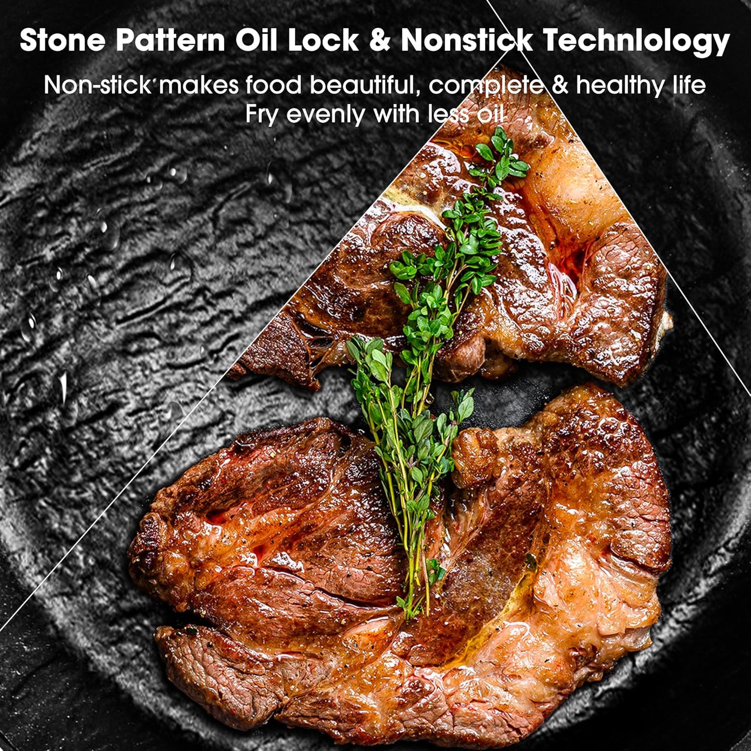 • INNOVATIVE NON STICK DESIGN: Carefully crafted using an innovative combination of a faux stone textured surface process and a one-piece die casting of high quality aluminum for nonstick pan. This unique combination not only provides an excellent non-stick surface, but also minimizes the contact area between food and the pan. Ensuring a truly non-stick surface while distributing heat evenly for excellent heat retention.