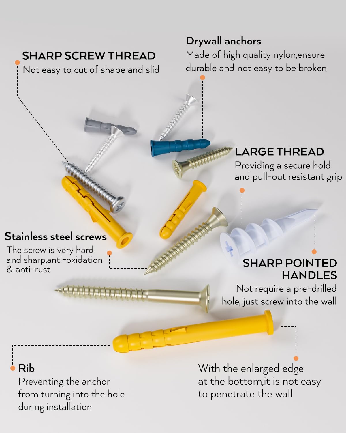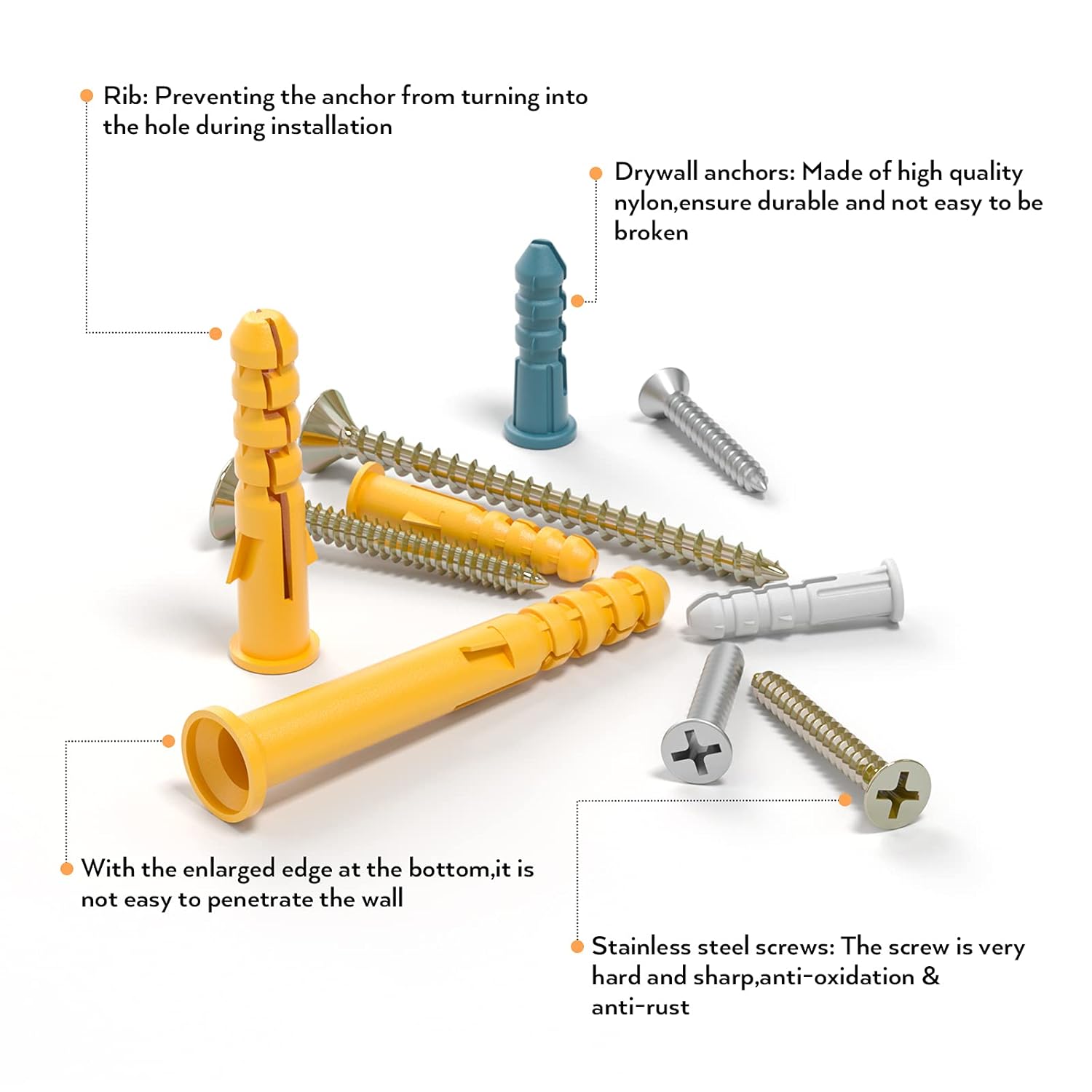 High Quality :The drywall anchors constructed from durable plastic(nylon) to last for years, and the The metal screws are made of high-carbon steel and galvanized for strong hardness and rust resistance. When you tighten the screw, the split in the ribbed anchors expand on two opposing sides,which can increased holding power.