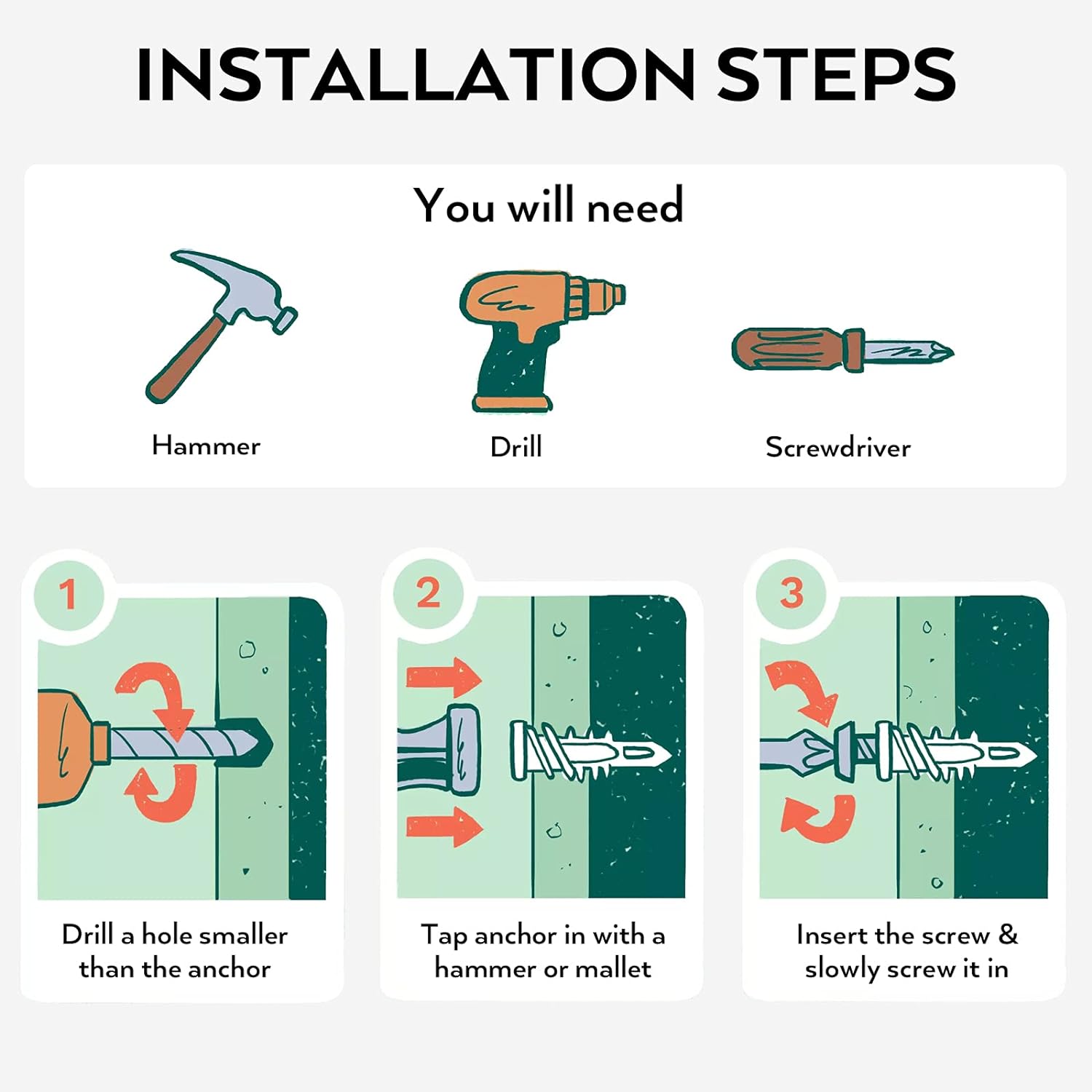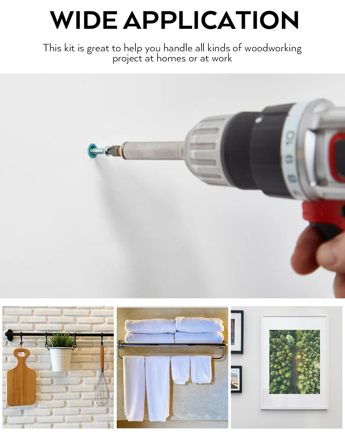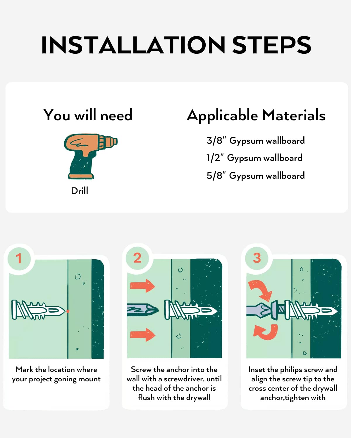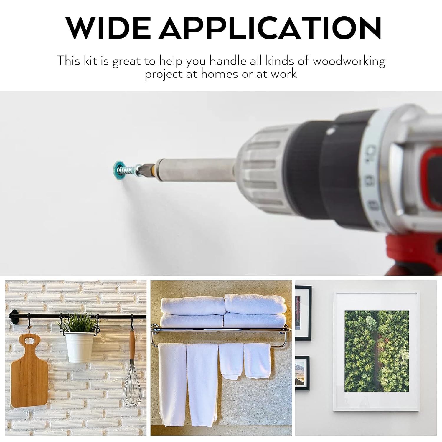Wide Application:This drywall anchor kit is great to help you handle all kinds of woodworking project at homes or at work,like hang bathroom or kitchen accessories, shelving, light fixtures, mirrors and more on various wall surfaces.It can works on brick walls, concrete walls, dry walls and wooden walls.